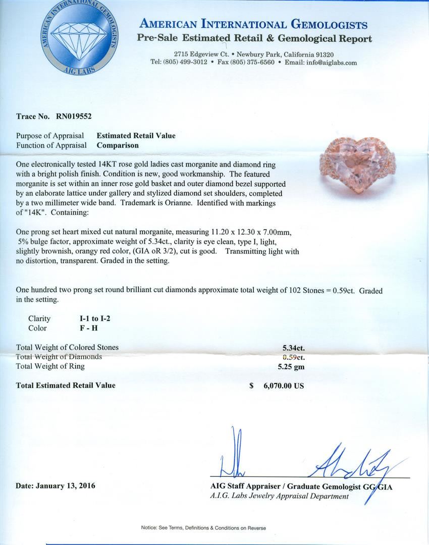One electronically tested 14KT rose gold ladies cast morganite and diamond ring with a bright polish finish. The featured morganite is set within an inner rose gold basket and outer diamond bezel supported by an elaborate lattice under gallery and stylized diamond set shoulders, completed by a two millimeter wide band. Trademark is Orianne. Identified with markings of "14K". Condition is new, good workmanship. Containing: One prong set heart mixed cut natural morganite, measuring 11.20 x 12.30 x 7.00mm, 5%. bulge factor, approximate weight of 5.34ct., clarity is eye clean, type I, light, slightly brownish, orangy red color, (GIA oR 3/2), cut is good. Transmitting light with no distortion, transparent. Graded in the setting. One Hundred Two prong set round brilliant cut diamonds approximate total weight of 102 Stones = 0.59ct. Graded in the setting. Clarity: I-1 to I-2. Color: F - H. Total Weight of Colored Stones 5.34ct. Total Weight of Diamonds 0.59ct. Total Weight of Ring 5.25gm. AIG Appraised at $6,070.00.