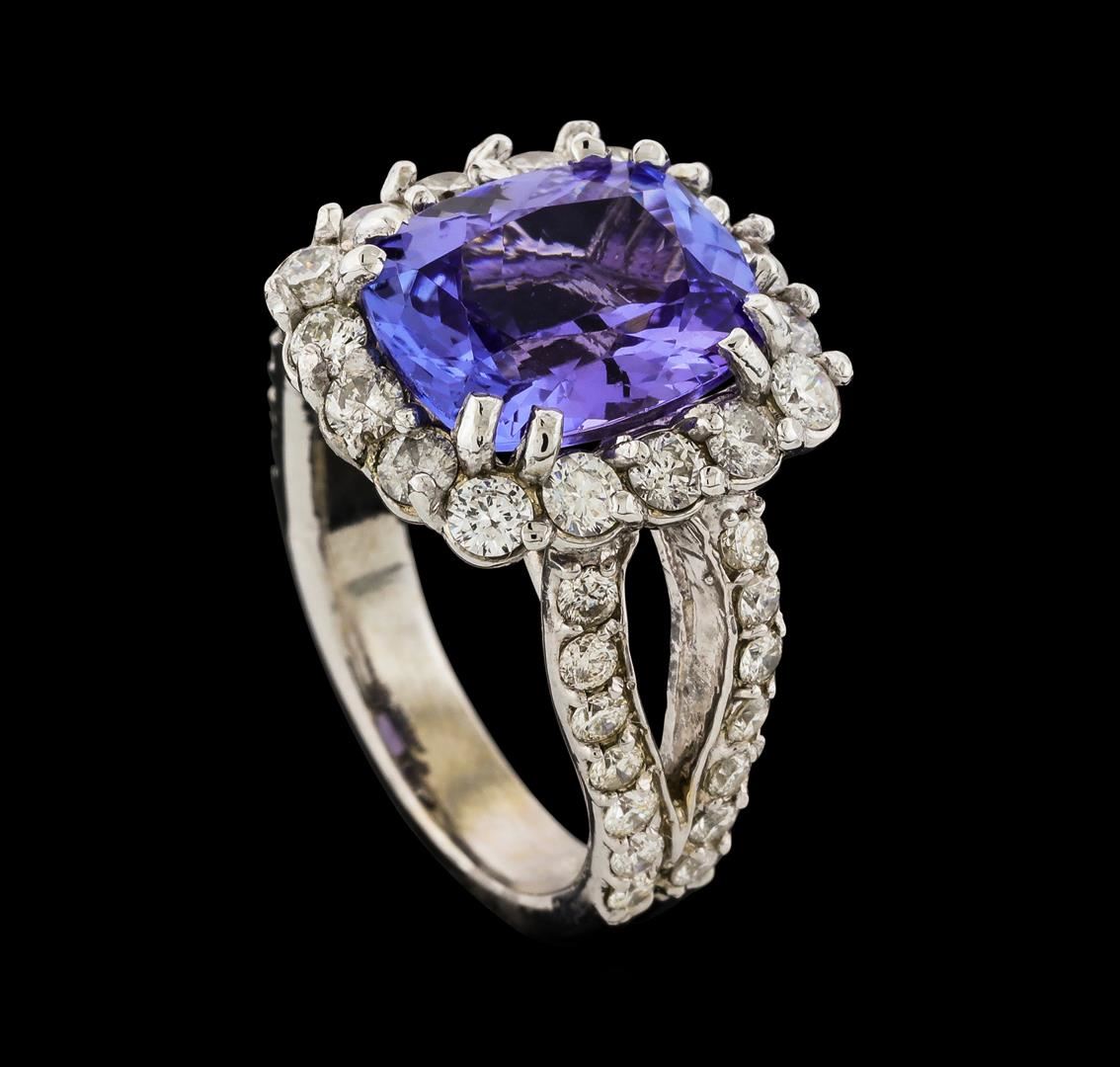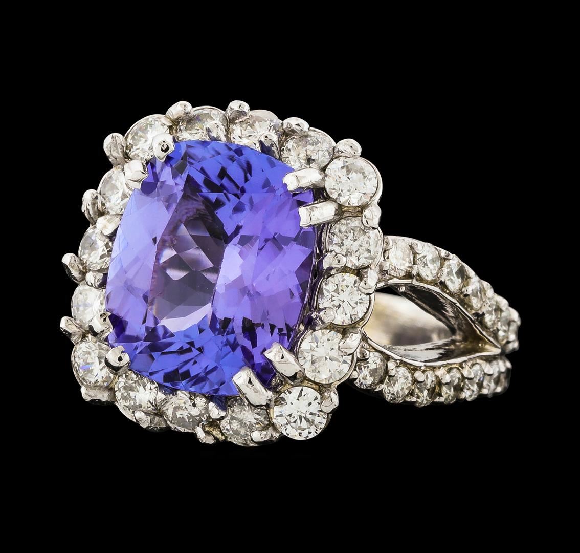 One electronically tested 14KT white gold lady's cast fashion ring with a split cathedral shank with a halo with a bright polish finish. The featured lady's ring has a double shank measuring 3.72 millimeters wide. Identified with markings of '14K'. Condition is new, good workmanship. Containing: One prong set rectangular cushion modified brilliant cut natural tanzanite, measuring 12.00 x 10.00 x 6.05mm, (depth est.) approximate weight of 5.34ct., clarity is eye clean, medium light, moderately strong, violetish blue color, (GIA vB 4/4), cut is very good. Transmitting light with no distortion, transparent. Colored gemstones are presumed to have been subjected to commonly used enhancement processes. Graded in the setting. Sixteen prong set round brilliant cut diamonds, measuring 2.60 - 2.50 x 1.56mm (depth est.) approximate total weight of 16 Stones = 1.00ct. Graded in the setting. Clarity SI-1 to SI-3. Color: G - I Cut Good Twenty-Eight prong set round brilliant cut diamonds, measuring 1.90 - 1.85 x 1.17mm (depth est.) approximate total weight of 28 Stones = 0.70ct. Graded in the setting. Clarity VS-2 to SI-2. Color: H - I Cut Good. Total Weight of Colored Stones 5.34ct.. Total Weight of Diamonds 1.70ct.. Total Weight of Ring 9.80gm. GAS Appraised at $12,235.00.