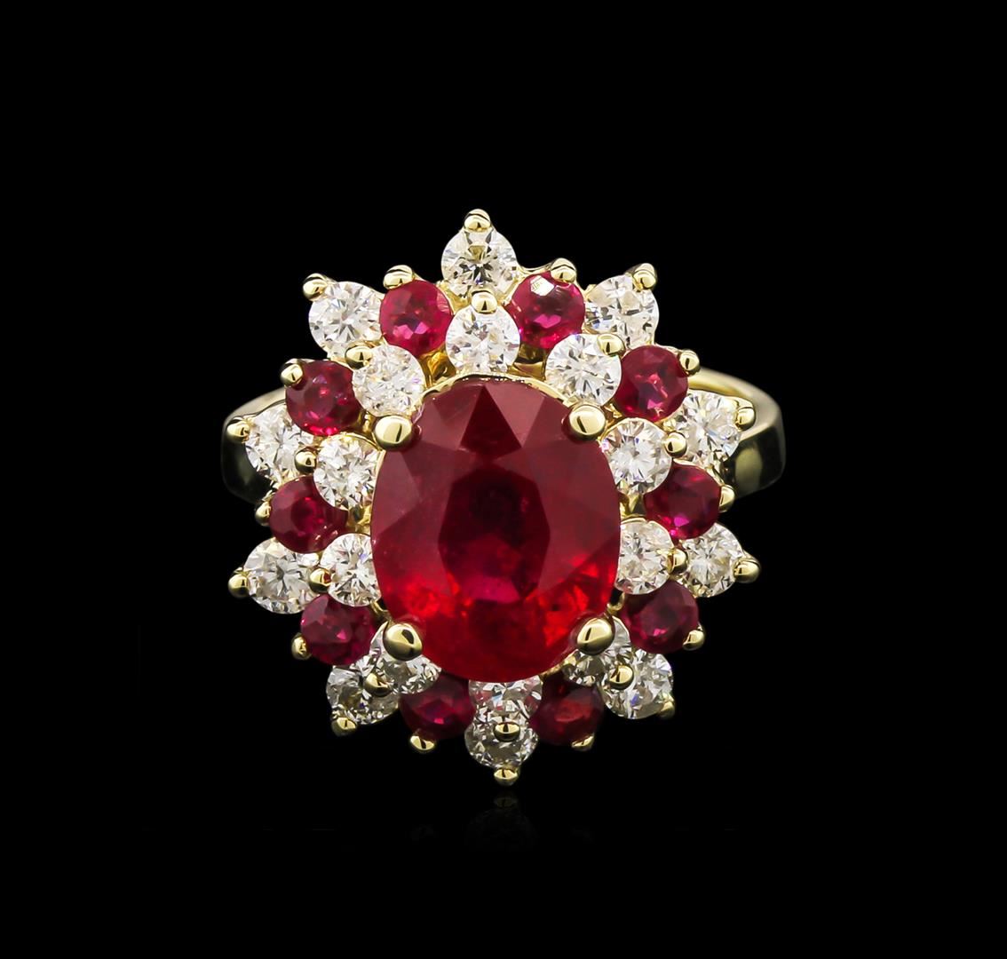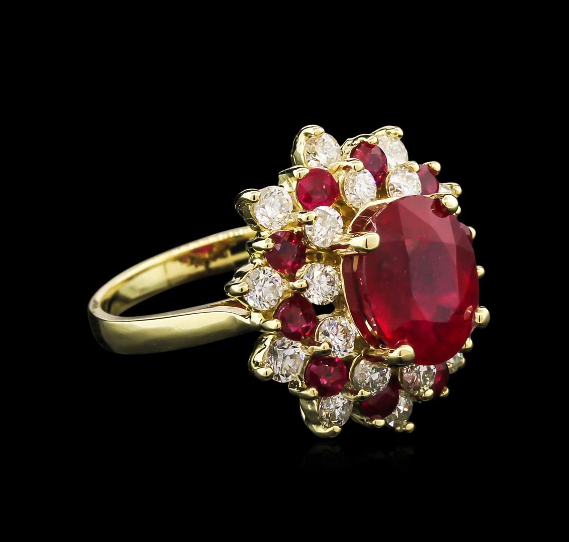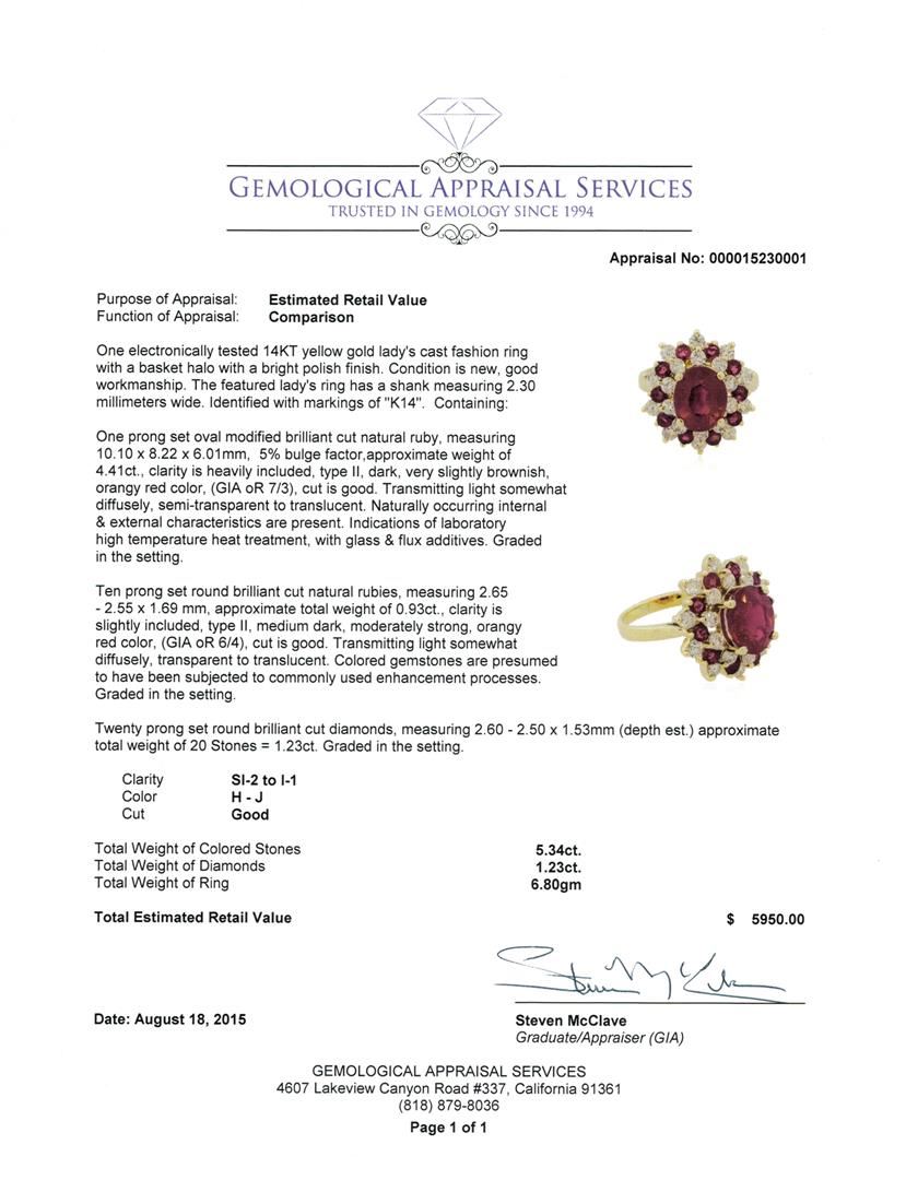 One electronically tested 14KT yellow gold lady's cast fashion ring with a basket halo with a bright polish finish. The featured lady's ring has a shank measuring 2.30 millimeters wide. Identified with markings of "K14". Condition is new, good workmanship. Containing: One prong set oval modified brilliant cut natural ruby, measuring 10.10 x 8.22 x 6.01mm, 5% bulge factor, approximate weight of 4.41ct., clarity is heavily included, type II, dark, very slightly brownish, orangy red color, (GIA oR 7/3), cut is good. Transmitting light somewhat diffusely, semi-transparent to translucent. Naturally occurring internal & external characteristics are present. Indications of laboratory high temperature heat treatment, with glass & flux additives. Graded in the setting. Ten prong set round brilliant cut natural rubies, measuring 2.65 - 2.55 x 1.69 mm, approximate total weight of 0.93ct., clarity is slightly included, type II, medium dark, moderately strong, orangy red color, (GIA oR 6/4), cut is good. Transmitting light somewhat diffusely, transparent to translucent. Colored gemstones are presumed to have been subjected to commonly used enhancement processes. Graded in the setting. Twenty prong set round brilliant cut diamonds, measuring 2.60 - 2.50 x 1.53mm (depth est.) approximate total weight of 20 Stones = 1.23ct. Graded in the setting. Clarity: SI-2 to I-1. Color: H - Good. Total Weight of Colored Stones 5.34ct. Total Weight of Diamonds 1.23ct. Total Weight of Ring 6.80gm. GAS Appraised at $5,950.00.