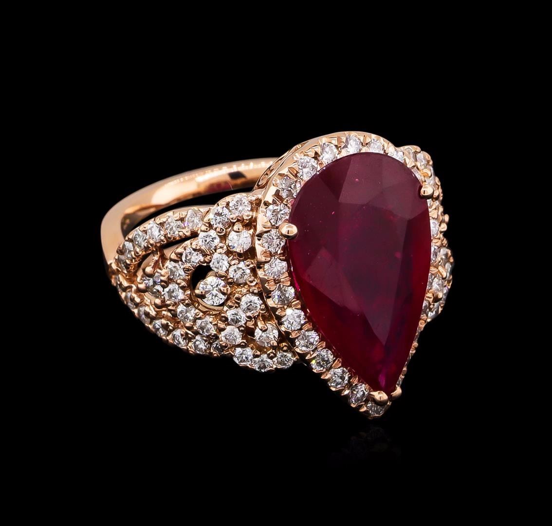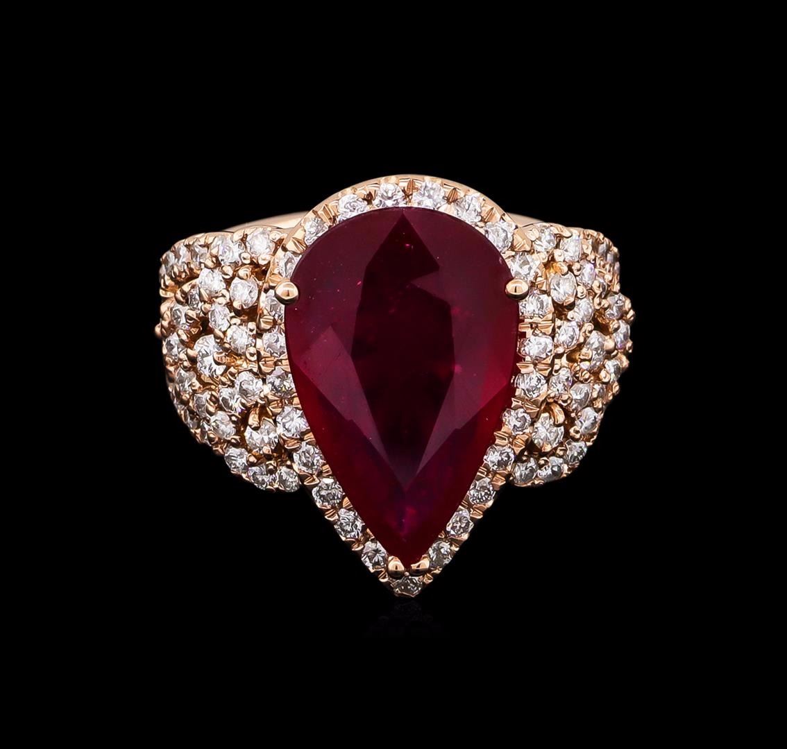 One electronically tested 14KT rose gold lady's cast fashion ring with a crossover split shank with a bright polish finish. The featured lady's ring has a shank measuring 6.05 millimeters wide. Identified with markings of "K14". Condition is new, good workmanship. Containing: One prong set pear modified brilliant cut natural ruby, measuring 16.60 x 10.23 x 3.90mm, approximate weight of 5.35ct., clarity is heavily included, type II, medium dark, moderately strong, red color, (GIA R 6/4), cut is good. Transmitting light somewhat diffusely, transparent to translucent. Naturally occurring internal & external characteristics are present. Indications of laboratory high temperature heat treatment, with glass & flux additives. Graded in the setting. Four prong set round brilliant cut diamonds, measuring 2.10 - 1.90 x 1.24mm (depth est.) approximate total weight of 4 Stones = 0.12ct. Graded in the setting. Clarity: SI-1 to SI-2. Color: H - I. Cut Good Twenty-Nine prong set round brilliant cut diamonds, measuring 1.60 - 1.50 x 0.96mm (depth est.) approximate total weight of 29 Stones = 0.41ct. Graded in the setting. Clarity: SI-1 to SI-2. Color: H - I. Cut Good Fifty-Eight prong set round brilliant cut diamonds, measuring 1.40 - 1.35 x 0.87mm (depth est.) approximate total weight of 58 Stones = 0.61ct. Graded in the setting. Clarity: SI-1 to SI-2. Color: H - I. Cut Good. Total Weight of Colored Stones 5.35ct. Total Weight of Diamonds 1.14ct. Total Weight of Ring 10.00gm. GAS Appraised at $7,440.00.