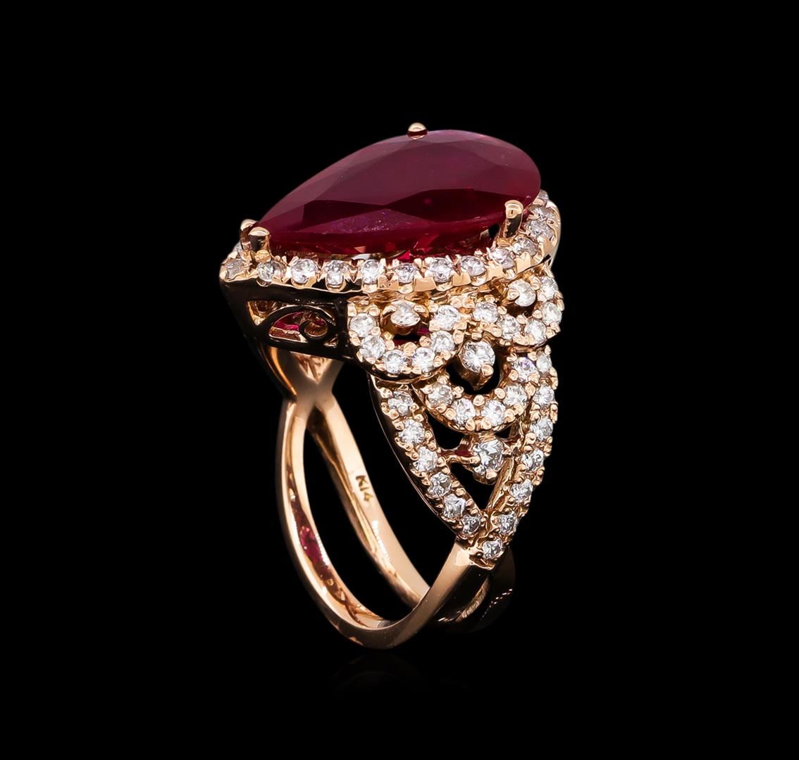 One electronically tested 14KT rose gold lady's cast fashion ring with a crossover split shank with a bright polish finish. The featured lady's ring has a shank measuring 6.05 millimeters wide. Identified with markings of "K14". Condition is new, good workmanship. Containing: One prong set pear modified brilliant cut natural ruby, measuring 16.60 x 10.23 x 3.90mm, approximate weight of 5.35ct., clarity is heavily included, type II, medium dark, moderately strong, red color, (GIA R 6/4), cut is good. Transmitting light somewhat diffusely, transparent to translucent. Naturally occurring internal & external characteristics are present. Indications of laboratory high temperature heat treatment, with glass & flux additives. Graded in the setting. Four prong set round brilliant cut diamonds, measuring 2.10 - 1.90 x 1.24mm (depth est.) approximate total weight of 4 Stones = 0.12ct. Graded in the setting. Clarity: SI-1 to SI-2. Color: H - I. Cut Good Twenty-Nine prong set round brilliant cut diamonds, measuring 1.60 - 1.50 x 0.96mm (depth est.) approximate total weight of 29 Stones = 0.41ct. Graded in the setting. Clarity: SI-1 to SI-2. Color: H - I. Cut Good Fifty-Eight prong set round brilliant cut diamonds, measuring 1.40 - 1.35 x 0.87mm (depth est.) approximate total weight of 58 Stones = 0.61ct. Graded in the setting. Clarity: SI-1 to SI-2. Color: H - I. Cut Good. Total Weight of Colored Stones 5.35ct. Total Weight of Diamonds 1.14ct. Total Weight of Ring 10.00gm. GAS Appraised at $7,440.00.