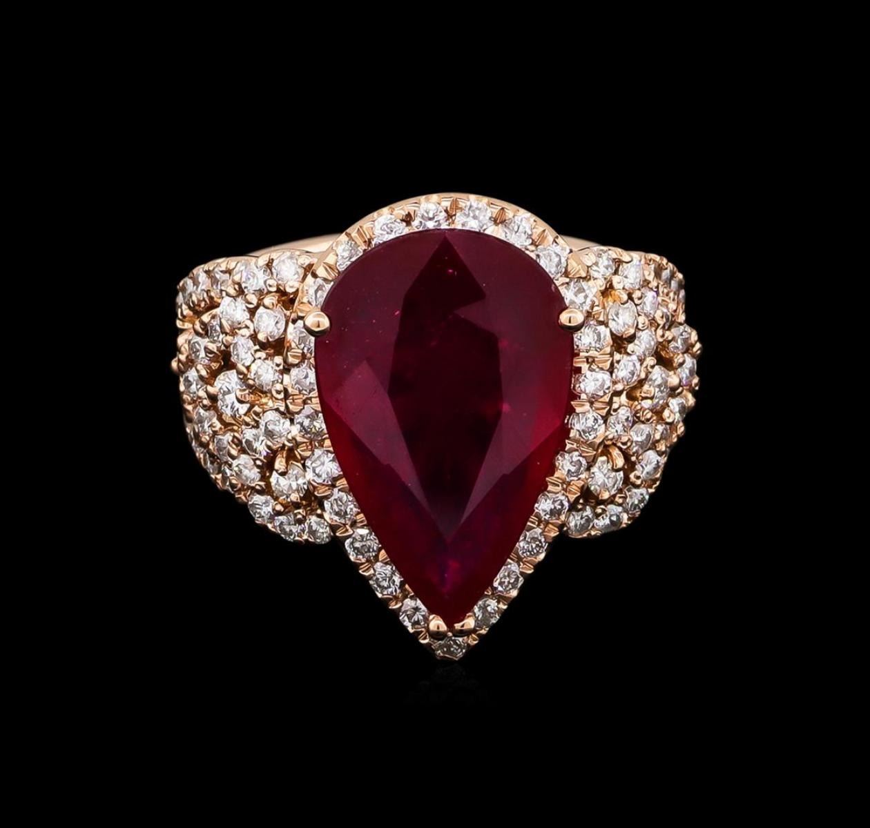 One electronically tested 14KT rose gold lady's cast fashion ring with a crossover split shank with a bright polish finish. The featured lady's ring has a shank measuring 6.05 millimeters wide. Identified with markings of "K14". Condition is new, good workmanship. Containing: One prong set pear modified brilliant cut natural ruby, measuring 16.60 x 10.23 x 3.90mm, approximate weight of 5.35ct., clarity is heavily included, type II, medium dark, moderately strong, red color, (GIA R 6/4), cut is good. Transmitting light somewhat diffusely, transparent to translucent. Naturally occurring internal & external characteristics are present. Indications of laboratory high temperature heat treatment, with glass & flux additives. Graded in the setting. Four prong set round brilliant cut diamonds, measuring 2.10 - 1.90 x 1.24mm (depth est.) approximate total weight of 4 Stones = 0.12ct. Graded in the setting. Clarity: SI-1 to SI-2. Color: H - I. Cut Good Twenty-Nine prong set round brilliant cut diamonds, measuring 1.60 - 1.50 x 0.96mm (depth est.) approximate total weight of 29 Stones = 0.41ct. Graded in the setting. Clarity: SI-1 to SI-2. Color: H - I. Cut Good Fifty-Eight prong set round brilliant cut diamonds, measuring 1.40 - 1.35 x 0.87mm (depth est.) approximate total weight of 58 Stones = 0.61ct. Graded in the setting. Clarity: SI-1 to SI-2. Color: H - I. Cut Good. Total Weight of Colored Stones 5.35ct. Total Weight of Diamonds 1.14ct. Total Weight of Ring 10.00gm. GAS Appraised.