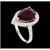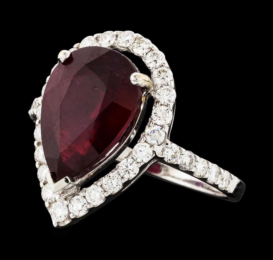 One electronically tested 14KT white gold lady's cast fashion ring with a halo with a bright polish finish. The featured lady's ring has a shank measuring 1.66 millimeters wide. Identified with markings of '14K'. Condition is new, good workmanship. Containing: One prong set pear modified mixed cut natural ruby, measuring 12.95 x 9.14 x 5.82mm, (depth est.) approximate weight of 5.35ct., clarity is heavily included, medium dark, moderately strong, red color, (GIA R 6/4), cut is good. Transmitting light somewhat diffusely, transparent to translucent. Indications of laboratory high temperature heat treatment, with glass & flux additives. Colored gemstones are presumed to have been subjected to commonly used enhancement processes. Graded in the setting. Thirty-Three prong set round brilliant cut diamonds, measuring 2.00 - 1.80 x 1.14mm (depth est.) approximate total weight of 33 Stones = 0.82ct. Graded in the setting. Clarity VS-2 to SI-2. Color: G - H Cut Good. Total Weight of Colored Stones 5.35ct.. Total Weight of Diamonds 0.82ct.. Total Weight of Ring 3.80gm. GAS Appraised at $4,750.00.