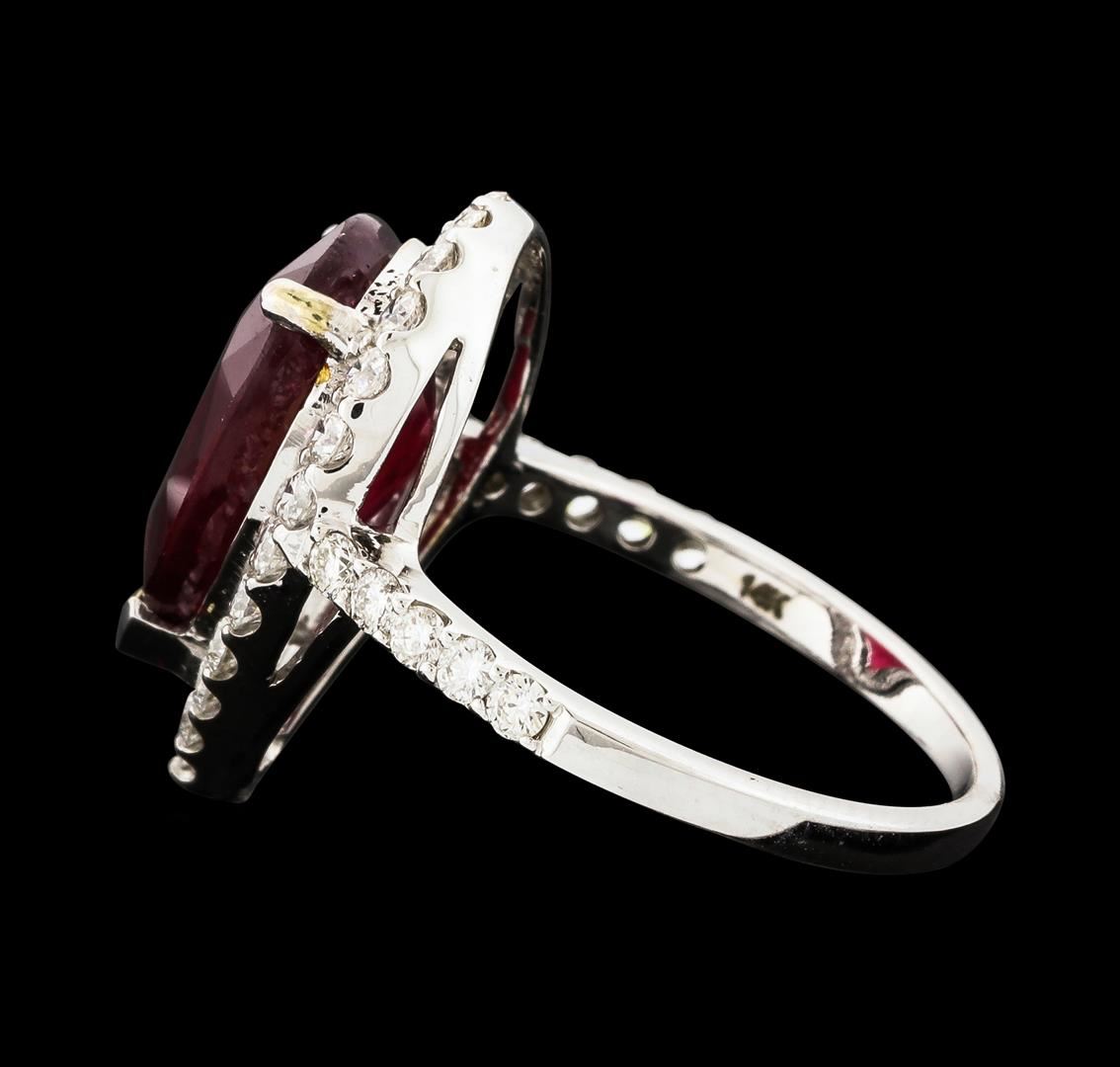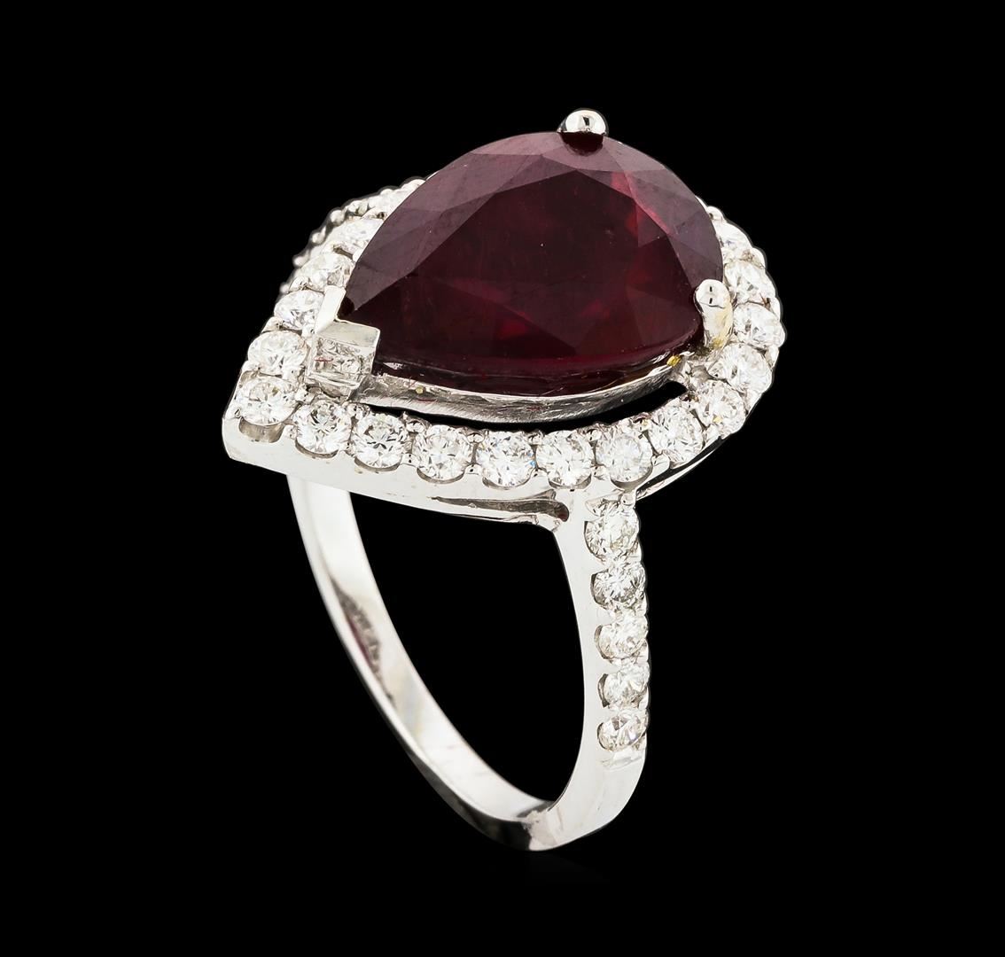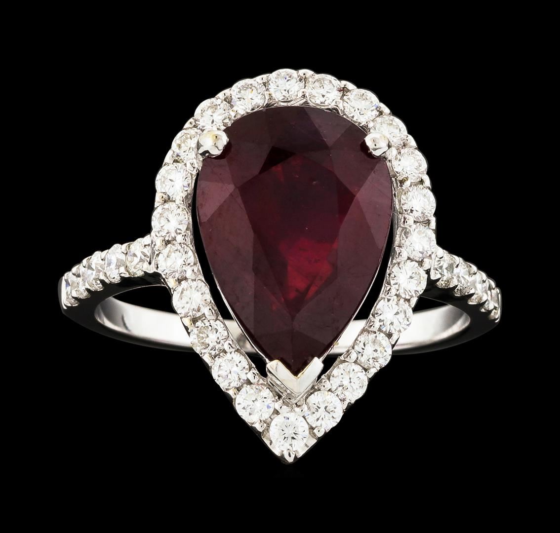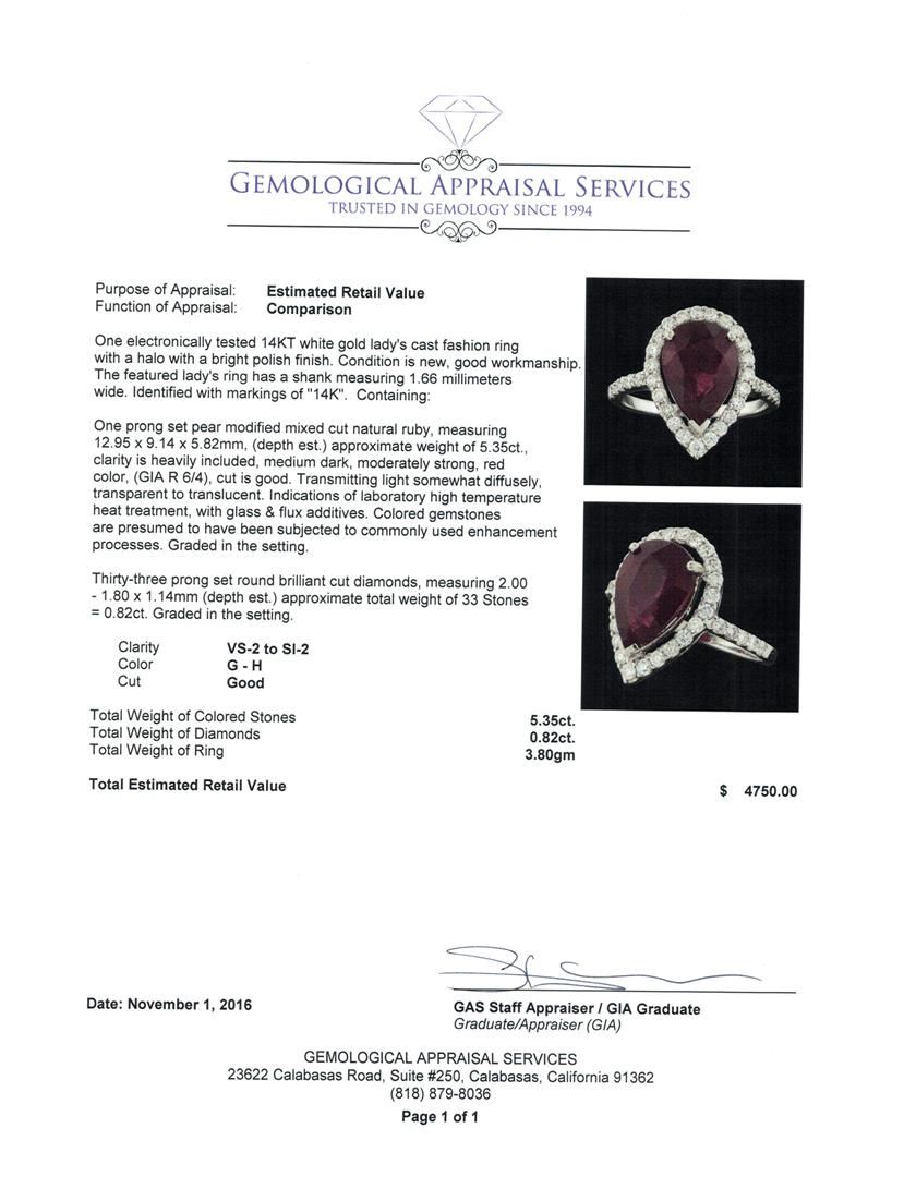 One electronically tested 14KT white gold lady's cast fashion ring with a halo with a bright polish finish. The featured lady's ring has a shank measuring 1.66 millimeters wide. Identified with markings of '14K'. Condition is new, good workmanship. Containing: One prong set pear modified mixed cut natural ruby, measuring 12.95 x 9.14 x 5.82mm, (depth est.) approximate weight of 5.35ct., clarity is heavily included, medium dark, moderately strong, red color, (GIA R 6/4), cut is good. Transmitting light somewhat diffusely, transparent to translucent. Indications of laboratory high temperature heat treatment, with glass & flux additives. Colored gemstones are presumed to have been subjected to commonly used enhancement processes. Graded in the setting. Thirty-Three prong set round brilliant cut diamonds, measuring 2.00 - 1.80 x 1.14mm (depth est.) approximate total weight of 33 Stones = 0.82ct. Graded in the setting. Clarity VS-2 to SI-2. Color: G - H Cut Good. Total Weight of Colored Stones 5.35ct.. Total Weight of Diamonds 0.82ct.. Total Weight of Ring 3.80gm. GAS Appraised at $4,750.00.