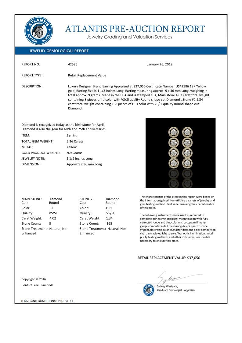 REF-842M2H -42586 ---- 5.36 CTW Diamond Designer Earrings 18K Yellow Gold ---- Luxury Designer Brand Earring Appraised at $37,050 Certificate Number US42586 18K Yellow gold, Earring Size is 1 1/2 Inches Long, Earring measuring approx. 9 x 36 mm Long, weighing in total approx. 9 grams. Made in the USA and is stamped 18K, Main stone 4.02 carat total weight containing 8 pieces of I-J color with VS/SI quality Round shape cut Diamond , Stone #2 1.34 carat total weight containing 168 pieces of G-H color with VS/SI quality Round shape cut Diamond
