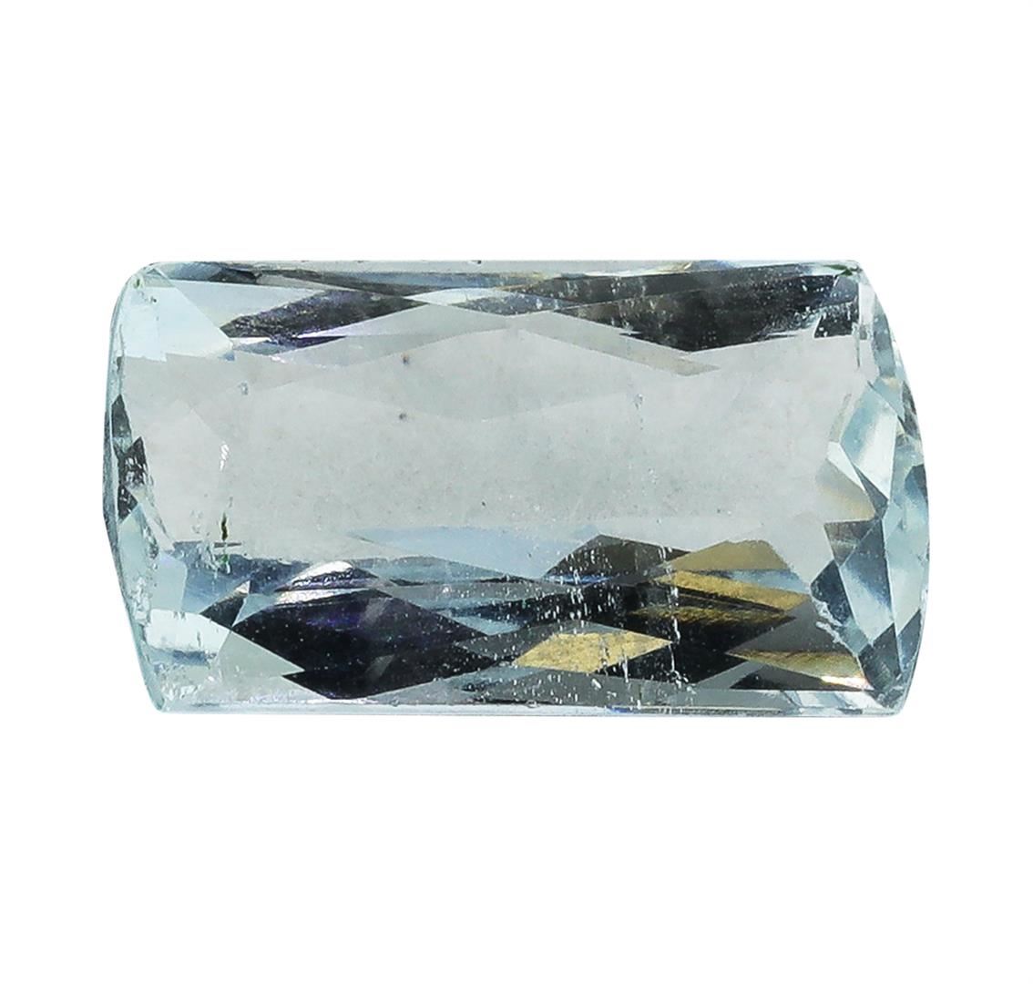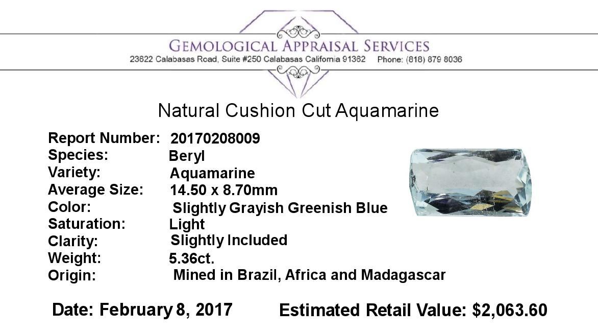 One natural cushion cut aquamarine with an exact weight of 5.36ct., clarity is slightly included, slightly grayish greenish blue, light. Gemological Appraisals Services estimates the retail value at $2063.6 GAS Appraised.