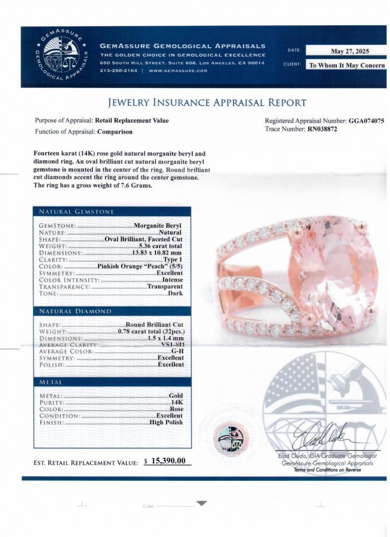 Fourteen karat (14K) rose gold natural morganite beryl and diamond ring. An oval brilliant cut natural morganite beryl gemstone is mounted in the center of the ring. Round brilliant cut diamonds accent the ring around the center gemstone. The ring has a gross weight of 7.6 Grams. #NATURAL GEMSTONE# GEMSTONE: Morganite Beryl; NATURE: Natural; SHAPE: Oval Brilliant, Faceted Cut; WEIGHT: 5.36 carat total; DIMENSIONS: 13.83 x 10.82mm; CLARITY: Type 1; COLOR: Pinkish Orange 'Peach" (5/5); SYMMETRY: Excellent; COLOR INTENSITY: Intense; TRANSPARENCY: Transparent; TONE: Dark #NATURAL DIAMOND# SHAPE: Round Brilliant Cut; WEIGHT: 0.78 carat total (32pcs.); DIMENSIONS: 1.5 x 1.4mm; AVERAGE CLARITY: VS1-SI1; AVERAGE COLOR: G-H; SYMMETRY: Excellent; POLLISH: Excellent #METAL# METAL: Gold; PURITY: 14K; COLOR: Rose; CONDITION: Excellent; FINISH: High Polish #Size: 7