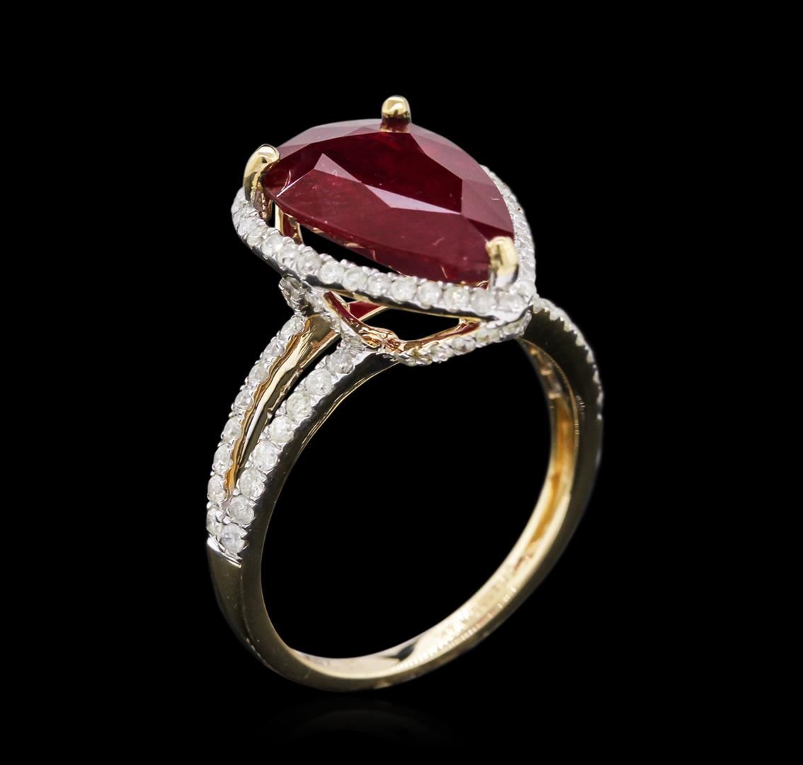 Fourteen karat (14K) yellow gold ruby and diamond ring. A pear cut ruby corundum gemstone is prong mounted in the center of the ring. Round brilliant cut diamonds accent the ring around the center gemstone and on both sides. The ring is cast stamped "14K" and has a gross weight of 3.8 Grams. Diamond(s): Shape: Round Brilliant Cut. Weight: 0.77 carat. Average Clarity: I1-I2. Average Color: I-K. Symmetry: Very Good. Polish: Very Good. Gemstone(s): GemStone: Ruby Corundum. Nature: Natural. Shape: Pear, Faceted. Quantity: 1, Mounted. Weight 5.36 carat. Dimensions: Length-14.90 mm. ; Width- 8.34 mm. Bulge: Visible. Clarity: I1, Type 3. Color: Red (5/5). Symmetry: Very Good. Color Intensity: Medium. Transparency: Transparent. Tone: Dark. Enhancements: Indications of high temperature heat treatment, with glass and flux additives. Metal(s): Metal: Gold, Stamped. Purity: 14K. Color: Yellow. Condition: Excellent. Finish: High polish. GGA Appraised.