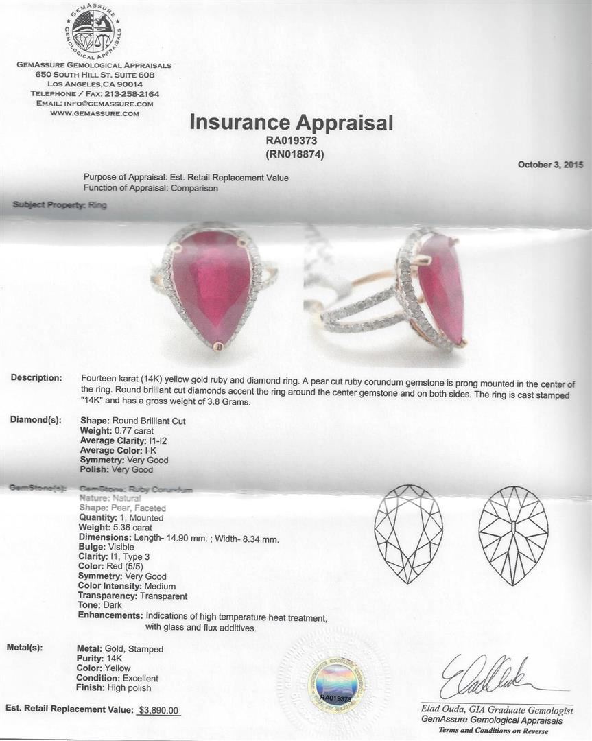 Fourteen karat (14K) yellow gold ruby and diamond ring. A pear cut ruby corundum gemstone is prong mounted in the center of the ring. Round brilliant cut diamonds accent the ring around the center gemstone and on both sides. The ring is cast stamped "14K" and has a gross weight of 3.8 Grams. Diamond(s): Shape: Round Brilliant Cut. Weight: 0.77 carat. Average Clarity: I1-I2. Average Color: I-K. Symmetry: Very Good. Polish: Very Good. Gemstone(s): GemStone: Ruby Corundum. Nature: Natural. Shape: Pear, Faceted. Quantity: 1, Mounted. Weight 5.36 carat. Dimensions: Length-14.90 mm. ; Width- 8.34 mm. Bulge: Visible. Clarity: I1, Type 3. Color: Red (5/5). Symmetry: Very Good. Color Intensity: Medium. Transparency: Transparent. Tone: Dark. Enhancements: Indications of high temperature heat treatment, with glass and flux additives. Metal(s): Metal: Gold, Stamped. Purity: 14K. Color: Yellow. Condition: Excellent. Finish: High polish. GGA Appraised.