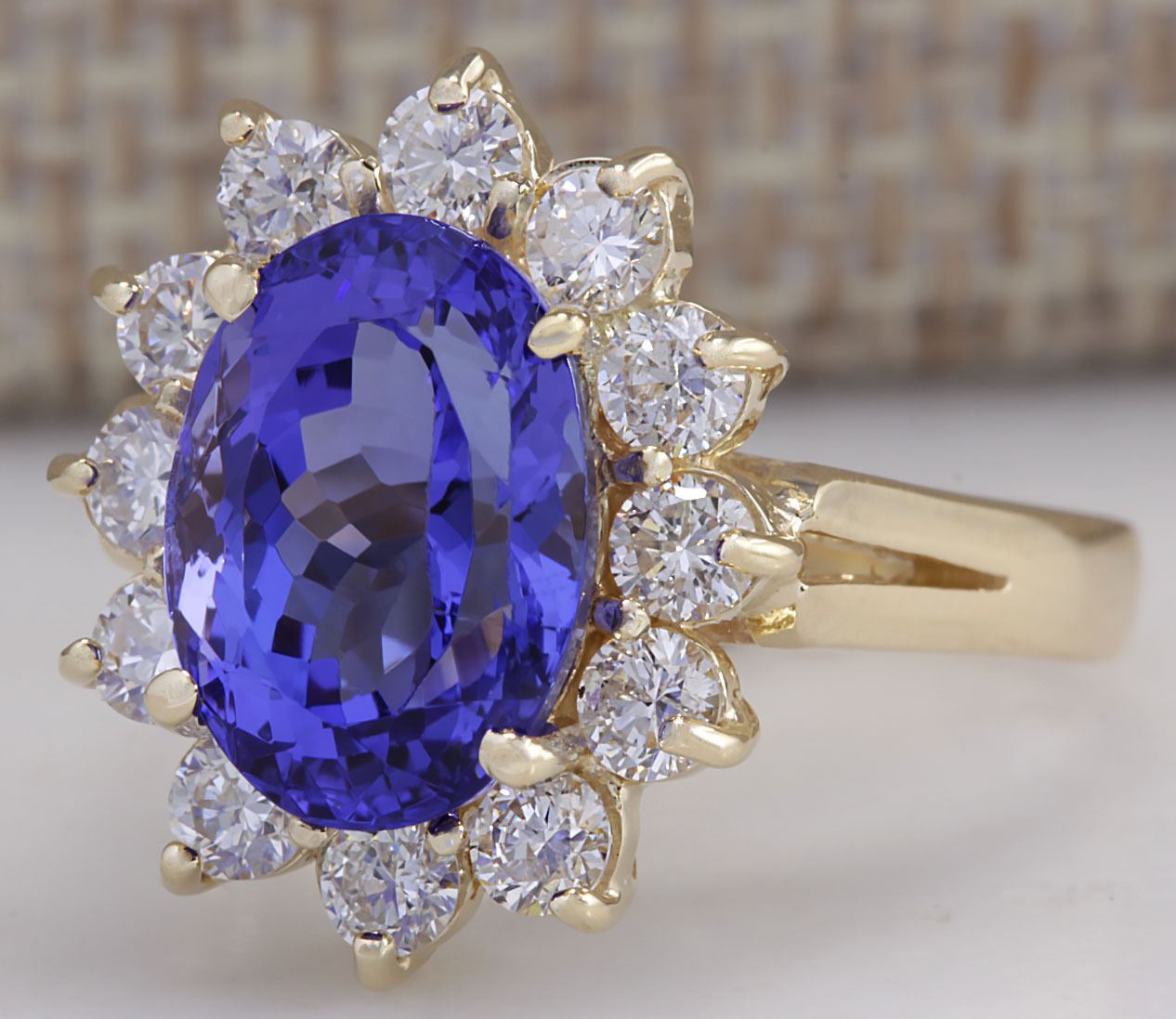 5.37 CTW Natural Blue Tanzanite And Diamond Ring 14K Solid Yellow Gold