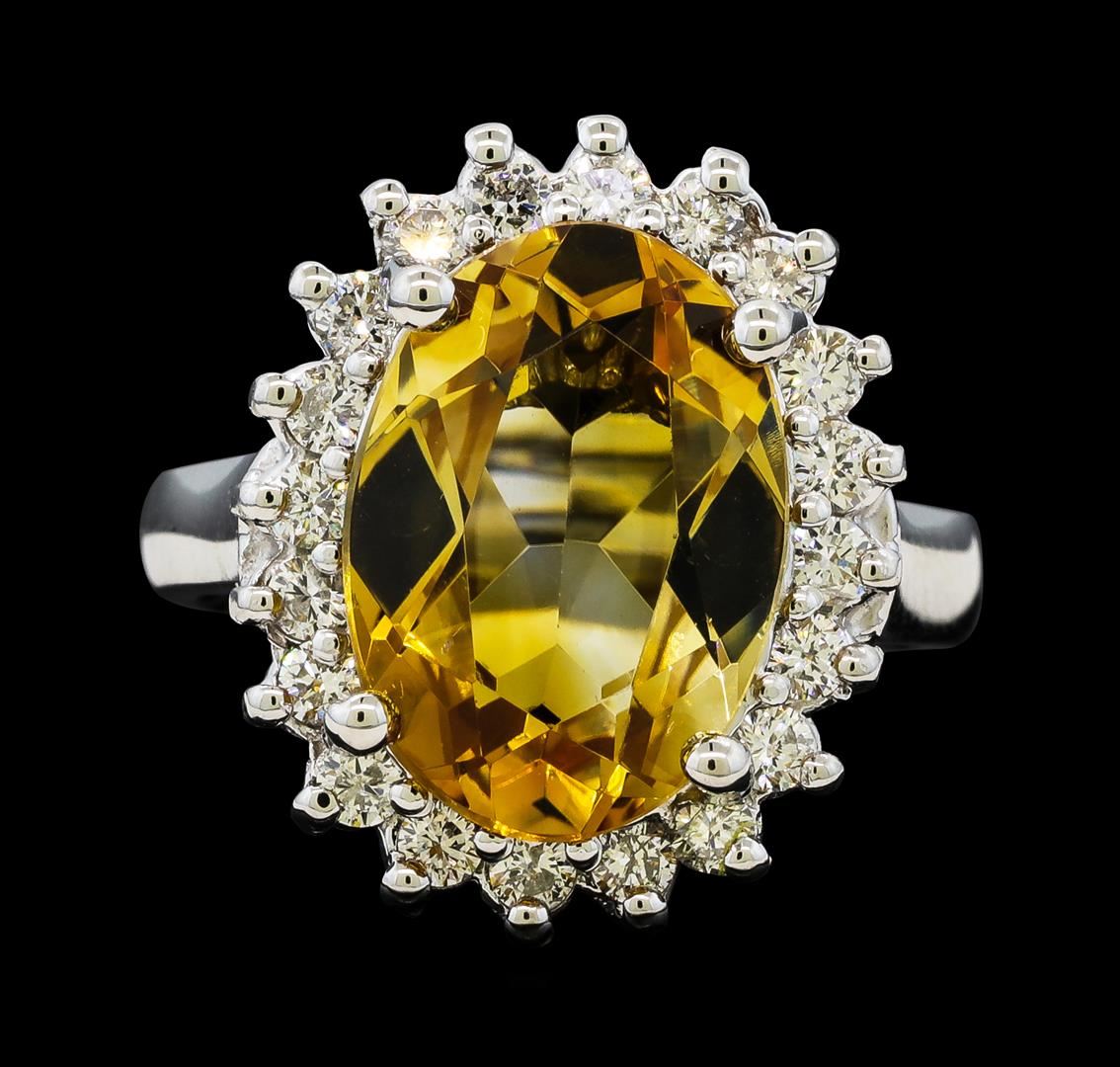 One Citrine Quartz and Diamond Ring including: 14KT White Gold weighing a total of 6.70 grams, Citrine Quartz weighing a total of 5.37ct and 20 Diamonds weighing a total of 0.62ctw.