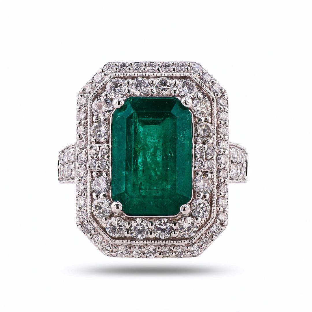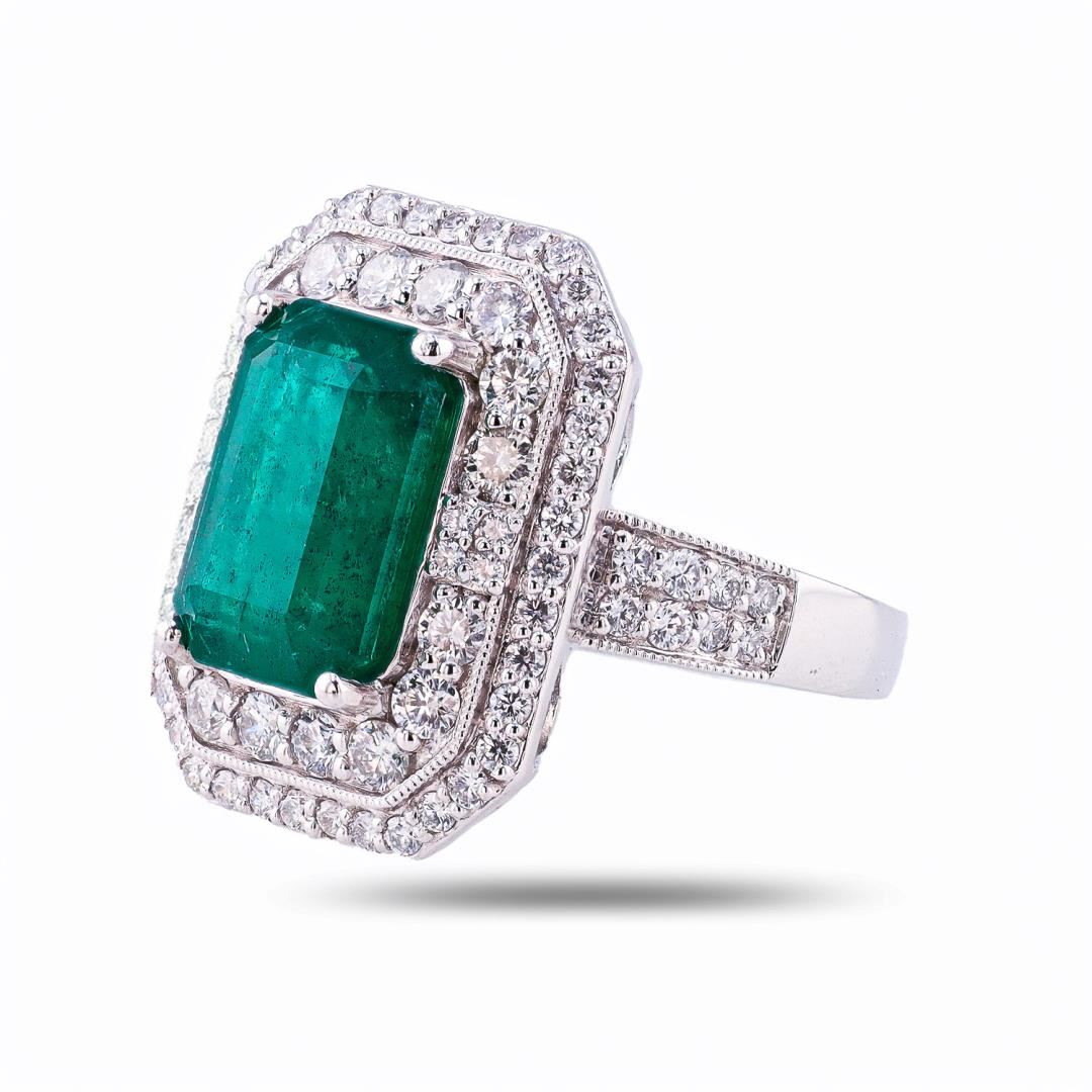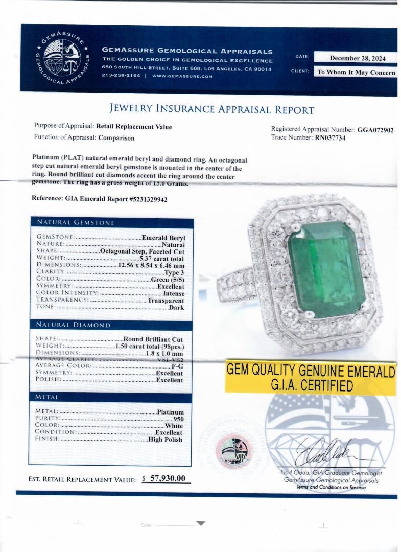 Platinum (PLAT) natural emerald beryl and diamond ring. An octagonal step cut natural emerald beryl gemstone is mounted in the center of the ring. Round brilliant cut diamonds accent the ring around the center gemstone. The ring has a gross weight of 13.0 Grams. Reference: GIA Emerald Report 5231329942 #NATURAL GEMSTONE# GEMSTONE: Emerald Beryl NATURE: Natural SHAPE: Octagonal Step, Faceted Cut WEIGHT: 5.37 carat total DIMENSIONS: 12.56 x 8.54 x 6.46mm CLARITY: Type 3 COLOR: Green (5/5) SYMMETRY: Excellent COLOR INTENSITY: Intense TRANSPARENCY: Transparent TONE: Dark #NATURAL DIAMOND# SHAPE: Round Brilliant Cut WEIGHT: 1.50 carat total (98pcs.) DIMENSIONS: 1.8 x 1.0mm AVERAGE CLARITY: VS1-VS2 AVERAGE COLOR: F-G SYMMETRY: Excellent POLISH: Excellent #METAL# METAL: Platinum PURITY: 950 COLOR: White CONDITION: Excellent FINISH: High Polish Size: 7 1/4