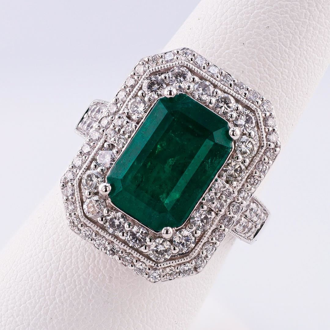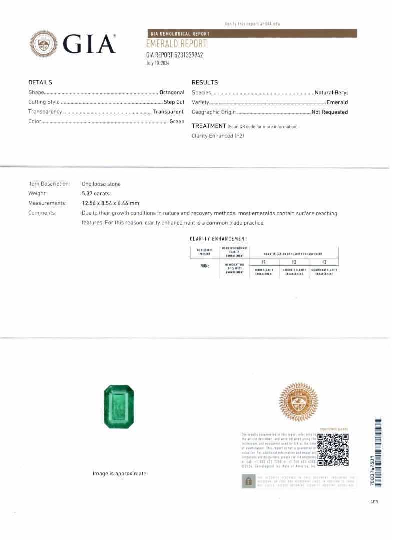 Platinum (PLAT) natural emerald beryl and diamond ring. An octagonal step cut natural emerald beryl gemstone is mounted in the center of the ring. Round brilliant cut diamonds accent the ring around the center gemstone. The ring has a gross weight of 13.0 Grams. Reference: GIA Emerald Report 5231329942 #NATURAL GEMSTONE# GEMSTONE: Emerald Beryl NATURE: Natural SHAPE: Octagonal Step, Faceted Cut WEIGHT: 5.37 carat total DIMENSIONS: 12.56 x 8.54 x 6.46mm CLARITY: Type 3 COLOR: Green (5/5) SYMMETRY: Excellent COLOR INTENSITY: Intense TRANSPARENCY: Transparent TONE: Dark #NATURAL DIAMOND# SHAPE: Round Brilliant Cut WEIGHT: 1.50 carat total (98pcs.) DIMENSIONS: 1.8 x 1.0mm AVERAGE CLARITY: VS1-VS2 AVERAGE COLOR: F-G SYMMETRY: Excellent POLISH: Excellent #METAL# METAL: Platinum PURITY: 950 COLOR: White CONDITION: Excellent FINISH: High Polish Size: 7 1/4