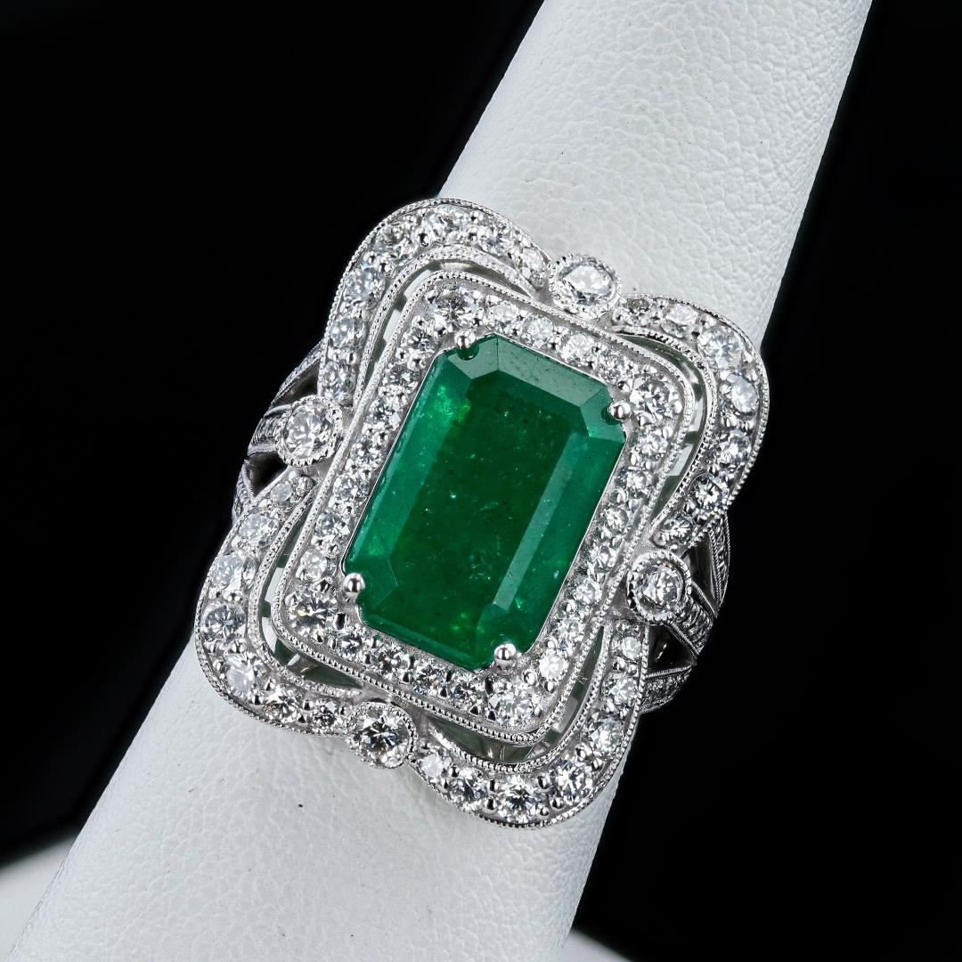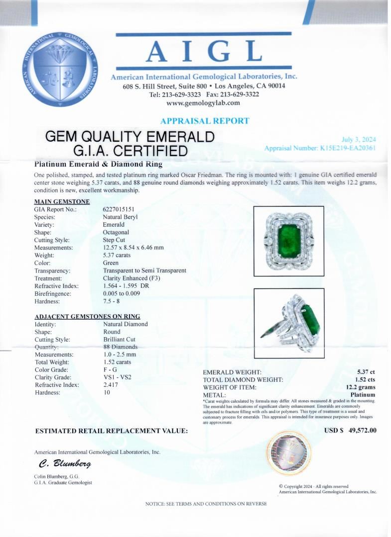 One polished, stamped, and tested platinum ring marked Oscar Friedman. The ring is mounted with: 1 genuine GIA certified emerald center stone weighing 5.37 carats, and 88 genuine round diamonds weighing approximately 1.52 carats. This item weighs 12.2 grams, condition is new, excellent workmanship. #MAIN GEMSTONE# GIA Report No.: 6227015151 Species: Natural Beryl Variety: Emerald Shape: Octagonal Cutting Style: Step Cut Measurements: 12.57 x 8.54 x 6.46mm Weight: 5.37 carats Color: Green Transparency: Transparent to Semi Transparent Treatment: Clarity Enhanced (F3) Refractive Index: 1.564 - 1.595 DR Birefringence: 0.005 to 0.009 Hardness: 7.5 - 8 #ADJACENT GEMSTONES ON RING# Identity: Natural Diamond Shape: Round Cutting Style: Brilliant Cut Quantity: 88 Diamonds Measurements: 1.0 - 2.5mm Total Weight: 1.52 carats Color Grade: F-G Clarity Grade: VS1-VS2 Refractive Index: 2.417 Hardness: 10 EMERALD WEIGHT: 5.37 ct TOTAL DIAMOND WEIGHT: 1.52 cts WEIGHT OF ITEM: 12.2 grams METAL: Platinum Size: 7