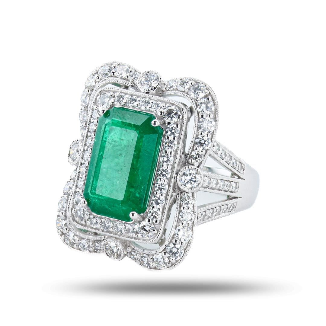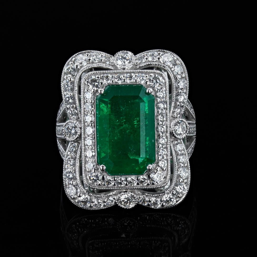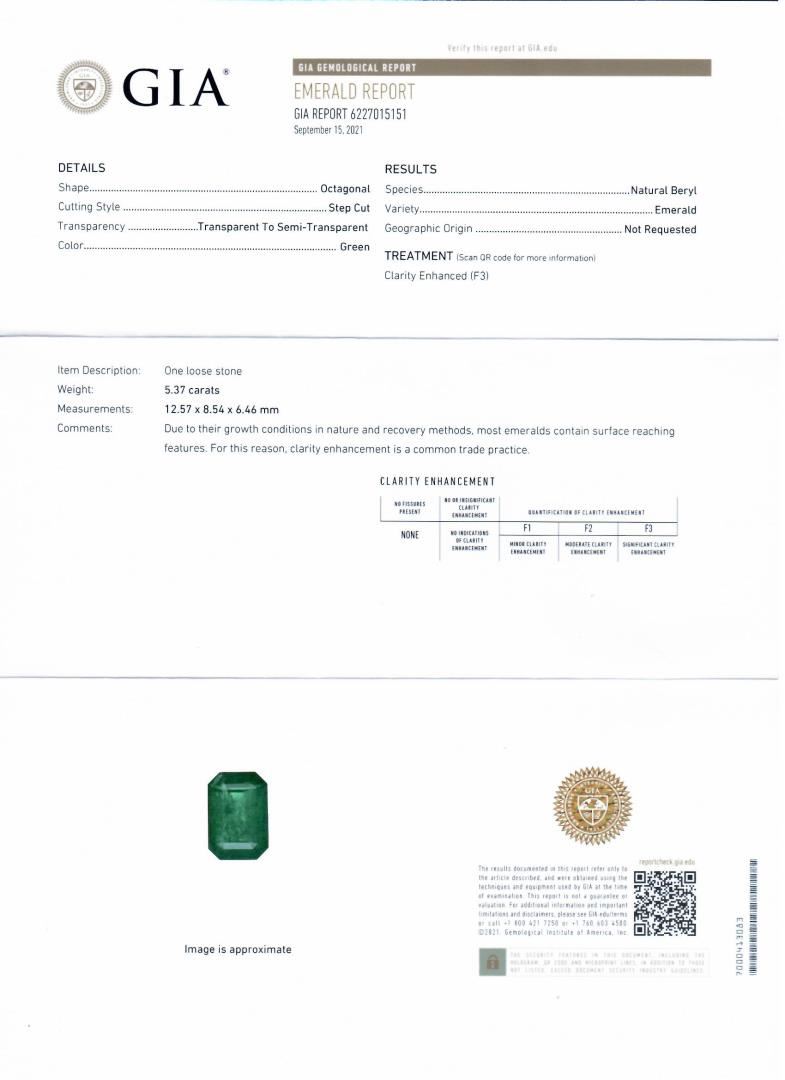 One polished, stamped, and tested platinum ring marked Oscar Friedman. The ring is mounted with: 1 genuine GIA certified emerald center stone weighing 5.37 carats, and 88 genuine round diamonds weighing approximately 1.52 carats. This item weighs 12.2 grams, condition is new, excellent workmanship. #MAIN GEMSTONE# GIA Report No.: 6227015151; Species: Natural Beryl; Variety: Emerald; Shape: Octagonal; Cutting Style: Step Cut; Measurements: 12.57 x 8.54 x 6.46mm; Weight: 5.37 carats; Color: Green; Transparency: Transparent to Semi Transparent; Treatment: Clarity Enhanced (F3); Refractive Index: 1.564 - 1.595 DR; Birefringence: 0.005 to 0.009; Hardness: 7.5 - 8 #ADJACENT GEMSTONES ON RING# Identity: Natural Diamond; Shape: Round; Cutting Style: Brilliant Cut; Quantity: 88 Diamonds; Measurements: 1.0 - 2.5mm; Total Weight: 1.52 carats; Color Grade: F-G; Clarity Grade: VS1-VS2; Refractive Index: 2.417; Hardness: 10; EMERALD WEIGHT: 5.37 ct; TOTAL DIAMOND WEIGHT: 1.52 cts; WEIGHT OF ITEM: 12.2 grams; METAL: Platinum #Size: 7