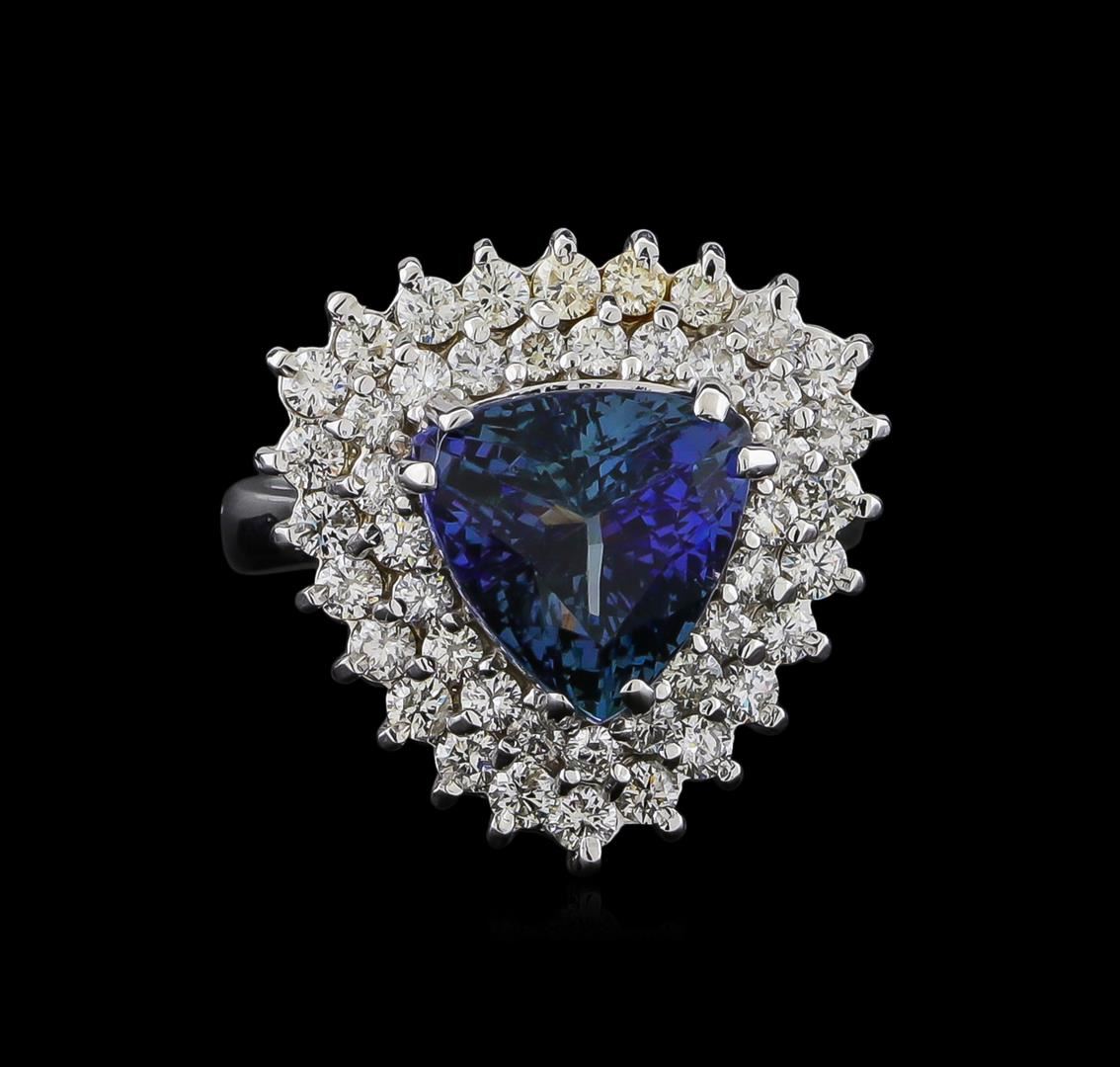 One electronically tested 14KT white gold lady's cast fashion ring with a double basket halo with a bright polish finish. The featured lady's ring has a shank measuring 3.07 millimeters wide. Identified with markings of "K14". Condition is new, good workmanship. Containing: One prong set triangle modified brilliant cut natural tanzanite, measuring 10.31 x 10.29 x 7.21mm, 16%. bulge factor, approximate weight of 5.38ct., clarity is eye clean, type I, medium dark, very slightly grayish, violetish blue color, (GIA vB 6/3), cut is very good. Transmitting light with no distortion, transparent. Colored gemstones are presumed to have been subjected to commonly used enhancement processes. Graded in the setting. Twenty-Four prong set round brilliant cut diamonds, measuring 2.10 - 2.00 x 1.27mm (depth est.) approximate total weight of 24 Stones = 0.78ct. Graded in the setting. Clarity: SI-1 to SI-2. Color: H - I. Cut Good Twenty-One prong set round brilliant cut diamonds, measuring 1.90 - 1.85 x 1.17mm (depth est.) approximate total weight of 21 Stones = 0.53ct. Graded in the setting. Clarity: VS-2 to SI-1. Color: H - I. Cut Good. Total Weight of Colored Stones 5.38ct. Total Weight of Diamonds 1.31ct. Total Weight of Ring 9.70gm. GAS Appraised at $13,260.00.