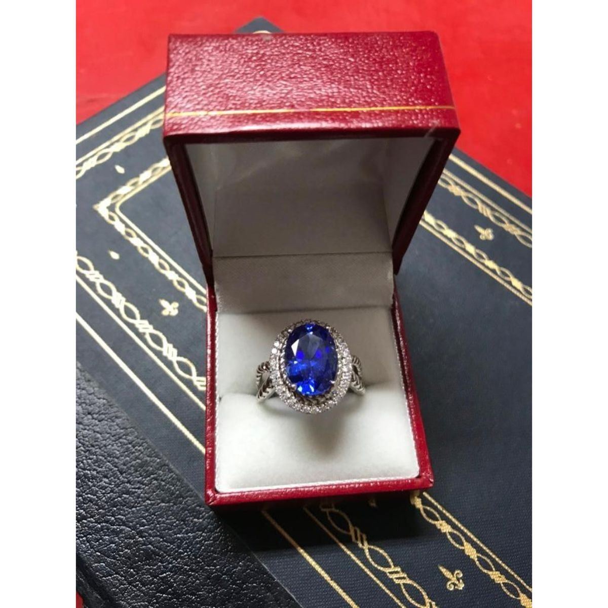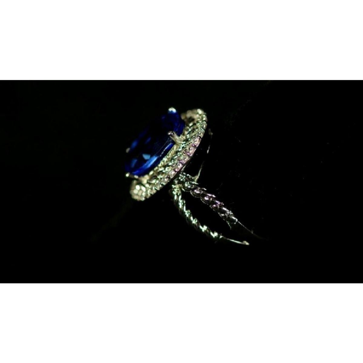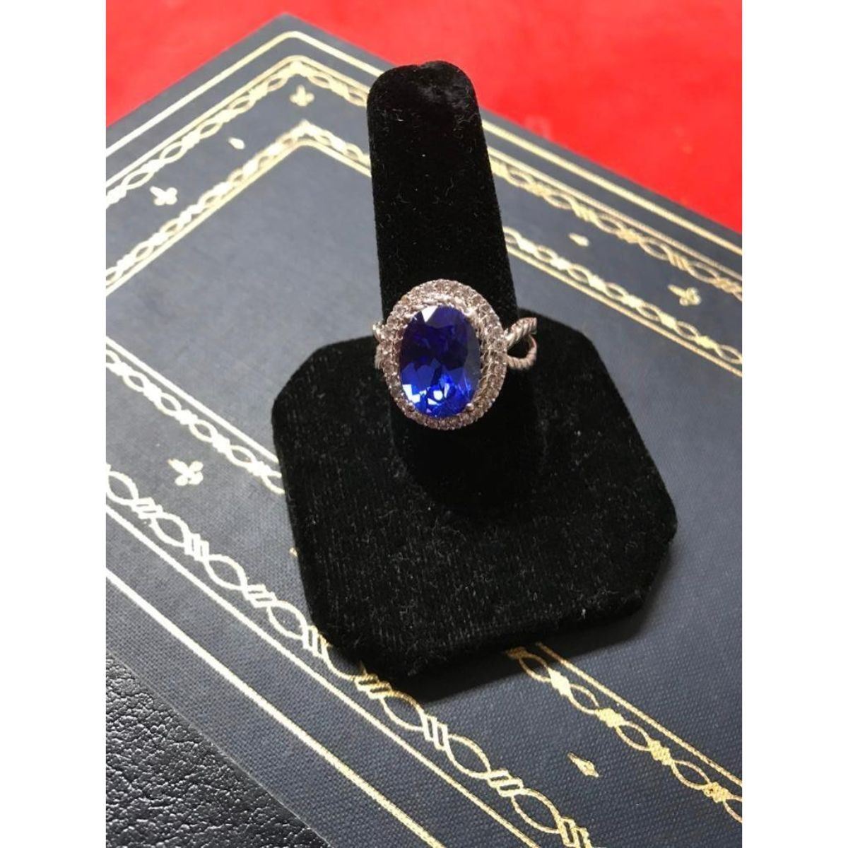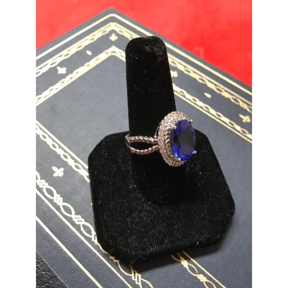 5.38ct oval faceted lab-created blue topaz ( 10 X 14mm ) surrounded by clear crystals, set into a silver-plated cocktail ring. Size 10.5. - 10415-050518-LA-00021