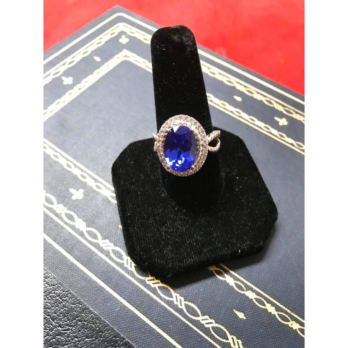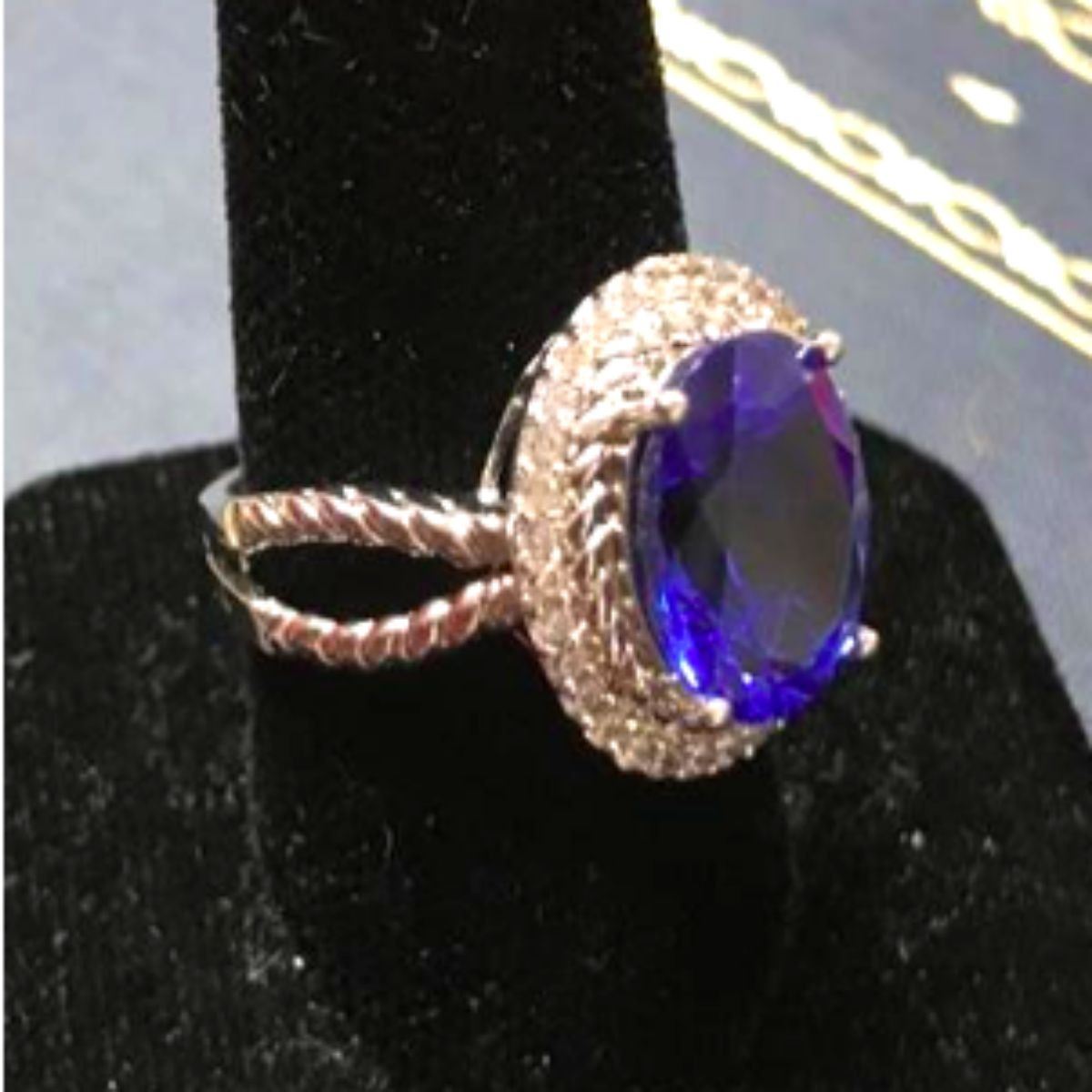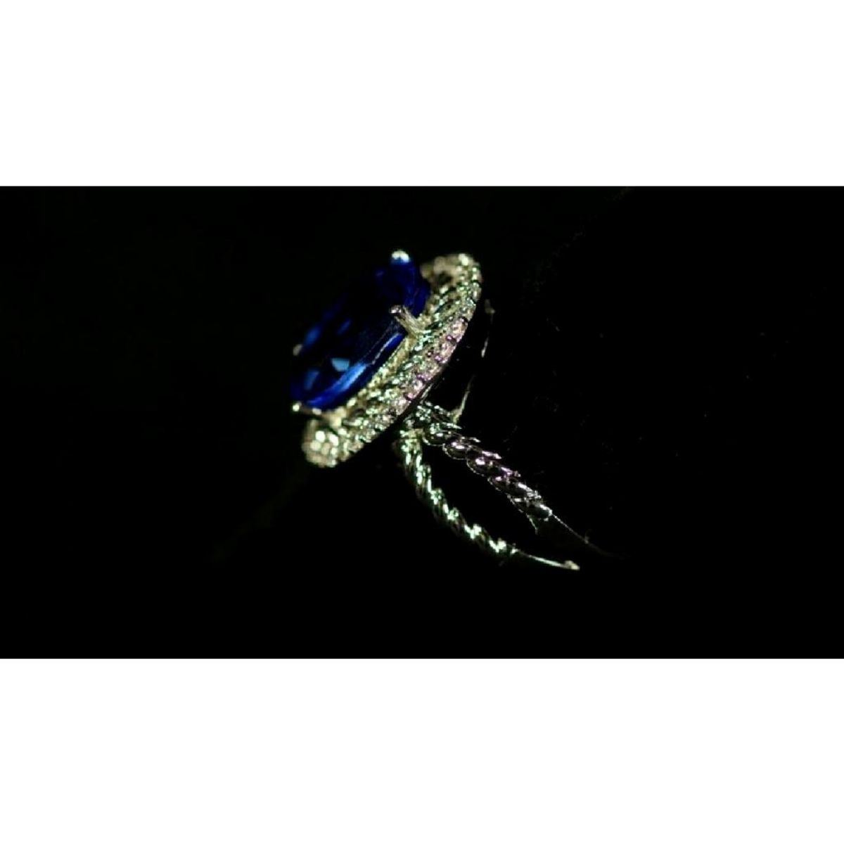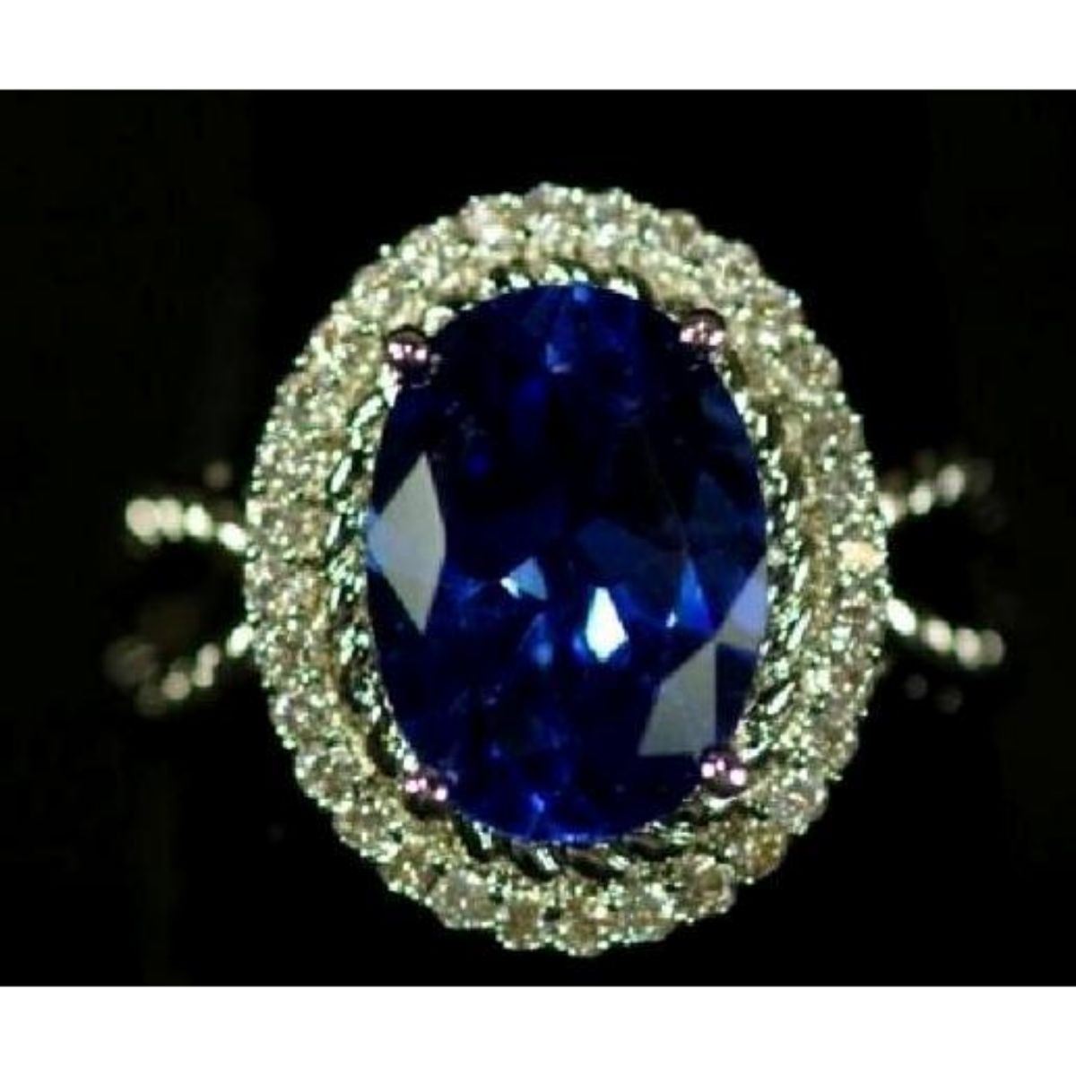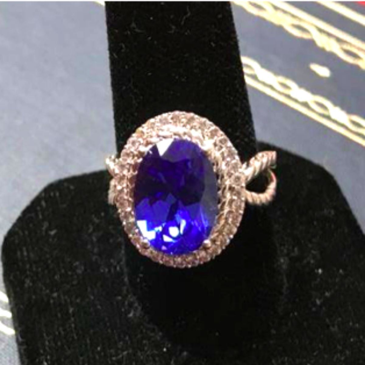 5.38ct oval faceted lab-created blue topaz ( 10 X 14mm ) surrounded by clear crystals, set into a silver-plated cocktail ring. Size 10.5. Can be easily cut down by a jeweler to a smaller size. - 10415-050518-LA-00021