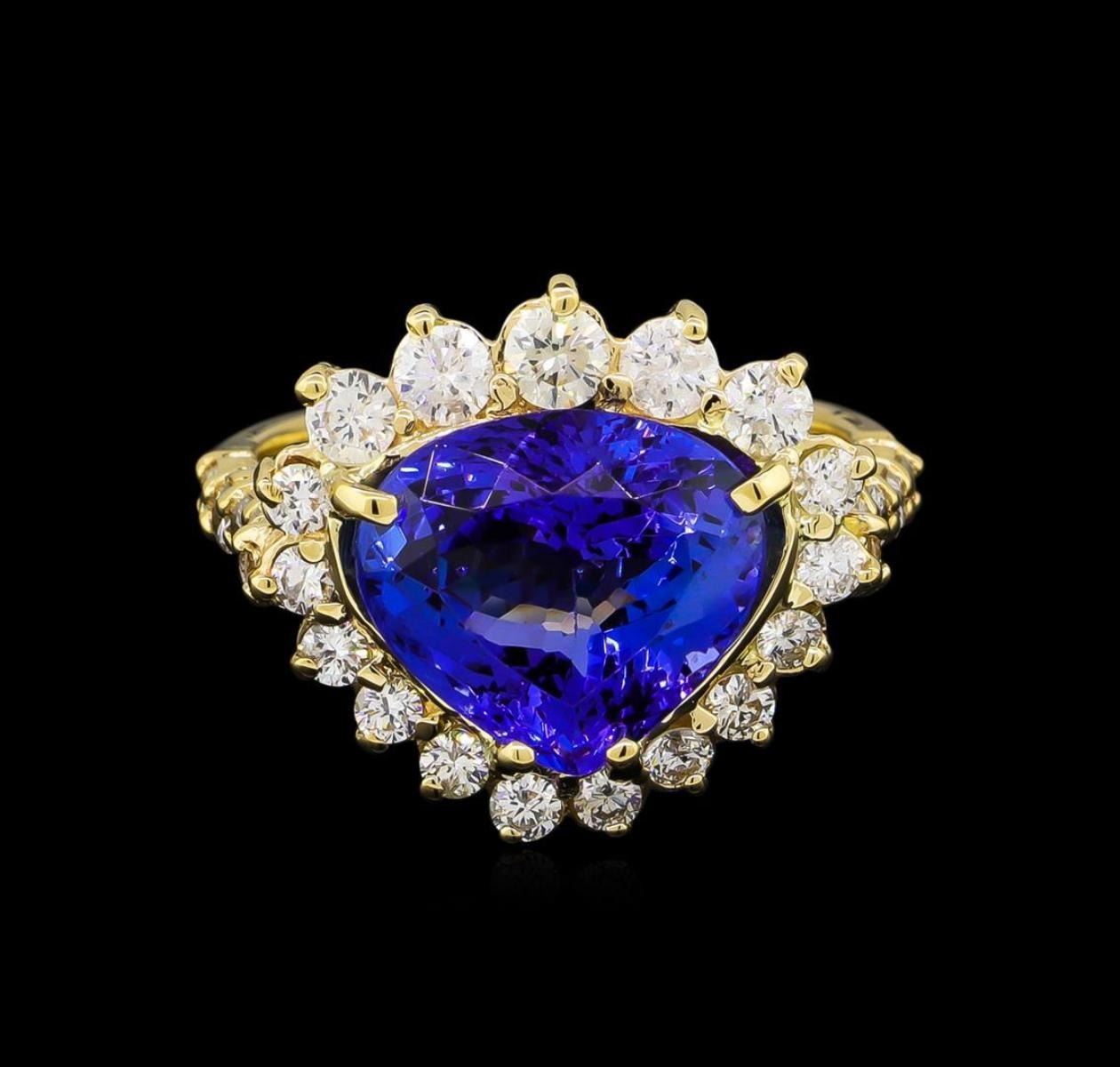 One electronically tested 14KT yellow gold lady's cast fashion ring with a basket halo with a bright polish finish. The featured lady's ring has a shank measuring 2.75 millimeters wide. Identified with markings of "K14". Condition is new, good workmanship. Containing: One prong set pear modified brilliant cut natural tanzanite, measuring 11.80 x 10.65 x 6.56mm, approximate weight of 5.39ct., clarity is eye clean, type I, medium dark, moderately strong, violetish blue color, (GIA vB 6/4), cut is very good. Transmitting light with no distortion, transparent. Colored gemstones are presumed to have been subjected to commonly used enhancement processes. Graded in the setting. Twenty-Two prong set round brilliant cut diamonds, measuring 2.15 - 2.00 x 1.25mm (depth est.) approximate total weight of 22 Stones = 0.72ct. Graded in the setting. Clarity: VS-2 to SI-2. Color: H - I. Cut Good Five prong set round brilliant cut diamonds, measuring 3.10 - 2.60 x 1.71mm (depth est.) approximate total weight of 5 Stones = 0.42ct. Graded in the setting. Clarity: SI-1 to SI-2. Color: H - I. Cut Good. Total Weight of Colored Stones 5.39ct. Total Weight of Diamonds 1.14ct. Total Weight of Ring 6.80gm. GAS Appraised.