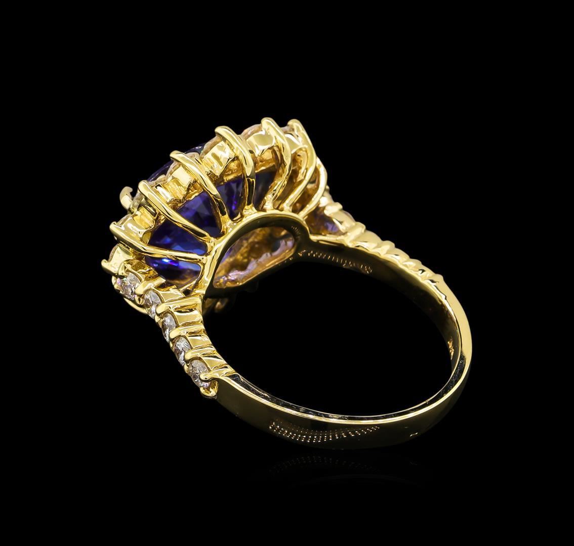 One electronically tested 14KT yellow gold lady's cast fashion ring with a basket halo with a bright polish finish. The featured lady's ring has a shank measuring 2.75 millimeters wide. Identified with markings of "K14". Condition is new, good workmanship. Containing: One prong set pear modified brilliant cut natural tanzanite, measuring 11.80 x 10.65 x 6.56mm, approximate weight of 5.39ct., clarity is eye clean, type I, medium dark, moderately strong, violetish blue color, (GIA vB 6/4), cut is very good. Transmitting light with no distortion, transparent. Colored gemstones are presumed to have been subjected to commonly used enhancement processes. Graded in the setting. Twenty-Two prong set round brilliant cut diamonds, measuring 2.15 - 2.00 x 1.25mm (depth est.) approximate total weight of 22 Stones = 0.72ct. Graded in the setting. Clarity: VS-2 to SI-2. Color: H - I. Cut Good Five prong set round brilliant cut diamonds, measuring 3.10 - 2.60 x 1.71mm (depth est.) approximate total weight of 5 Stones = 0.42ct. Graded in the setting. Clarity: SI-1 to SI-2. Color: H - I. Cut Good. Total Weight of Colored Stones 5.39ct. Total Weight of Diamonds 1.14ct. Total Weight of Ring 6.80gm. GAS Appraised.