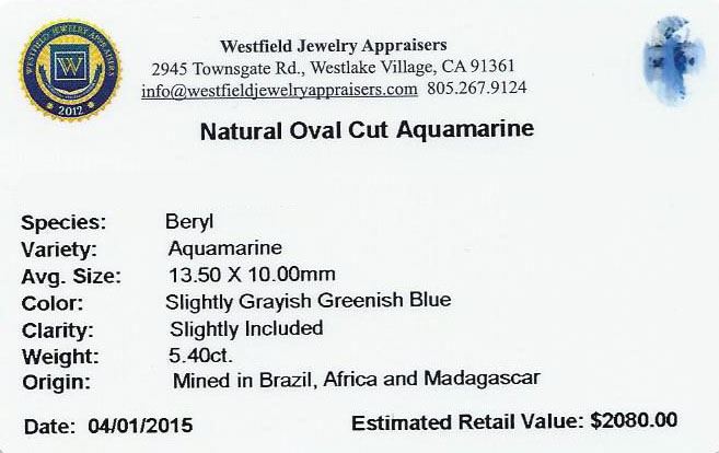 One oval cut natural aquamarine exact weight 5.40ct., clarity is slightly included, type I, medium, very slightly grayish, very slightly greenish blue color, (GIA vslgB 5/3), cut is good. Westfield Appraised at $2,080.00.