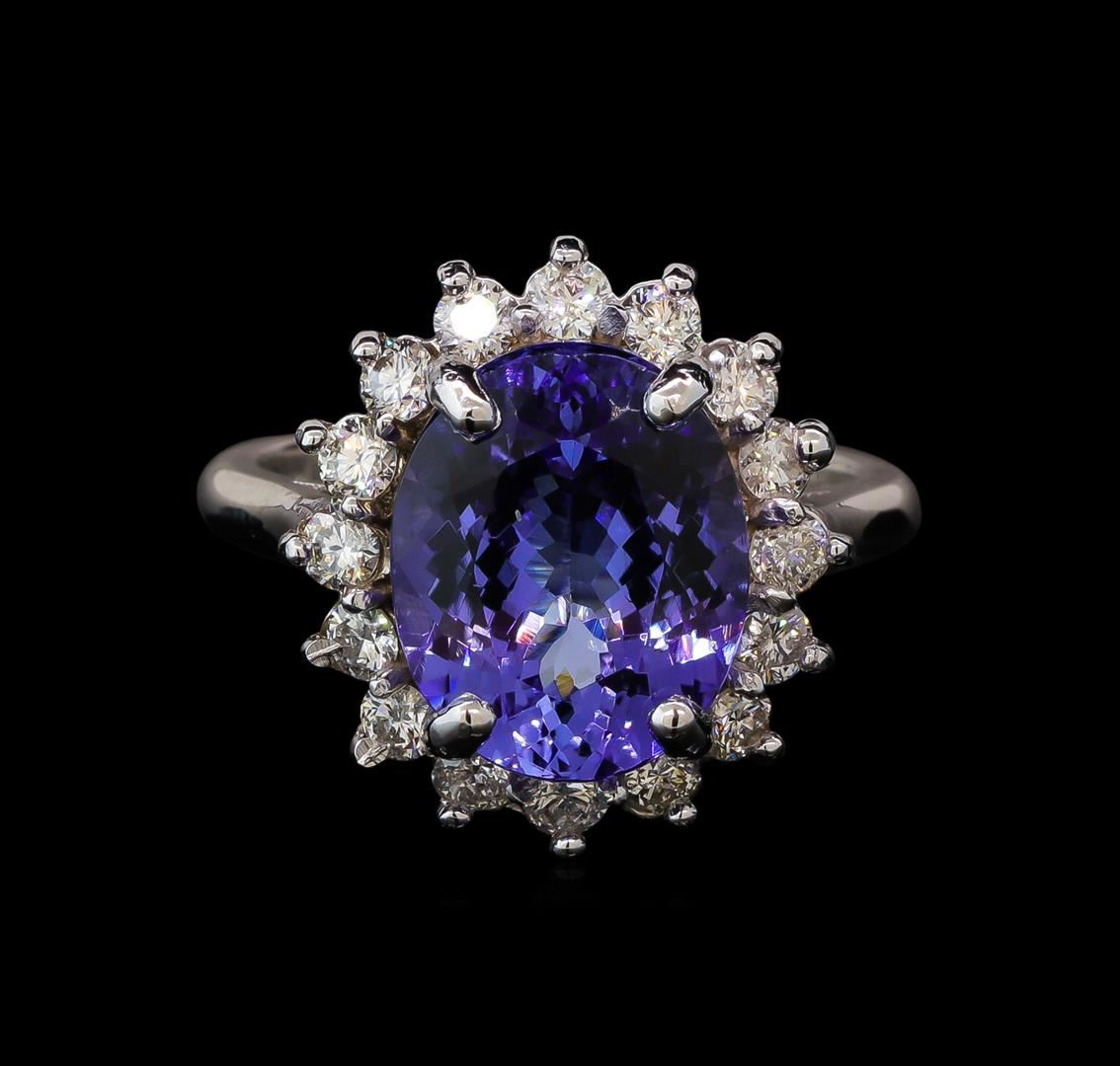 One electronically tested 14KT white gold lady's cast fashion ring with a basket halo with a bright polish finish. The featured lady's ring has a shank measuring 2.12 millimeters wide. Identified with markings of '14K'. Condition is new, good workmanship. Containing: One prong set oval modified brilliant cut natural tanzanite, measuring 12.19 x 9.87 x 6.17mm, (depth est.) 3%. bulge factor, approximate weight of 5.40ct., clarity is eye clean, medium, very slightly grayish, violetish blue color, (GIA vB 5/3), cut is very good. Transmitting light with no distortion, transparent. Colored gemstones are presumed to have been subjected to commonly used enhancement processes. Graded in the setting. Sixteen prong set round brilliant cut diamonds, measuring 2.40 - 2.35 x 1.48mm (depth est.) approximate total weight of 16 Stones = 0.82ct. Graded in the setting. Clarity SI-1 to I-1. Color: H - I Cut Good. Total Weight of Colored Stones 5.40ct.. Total Weight of Diamonds 0.82ct.. Total Weight of Ring 6.30gm GAS Appraised at $10,975.00.
