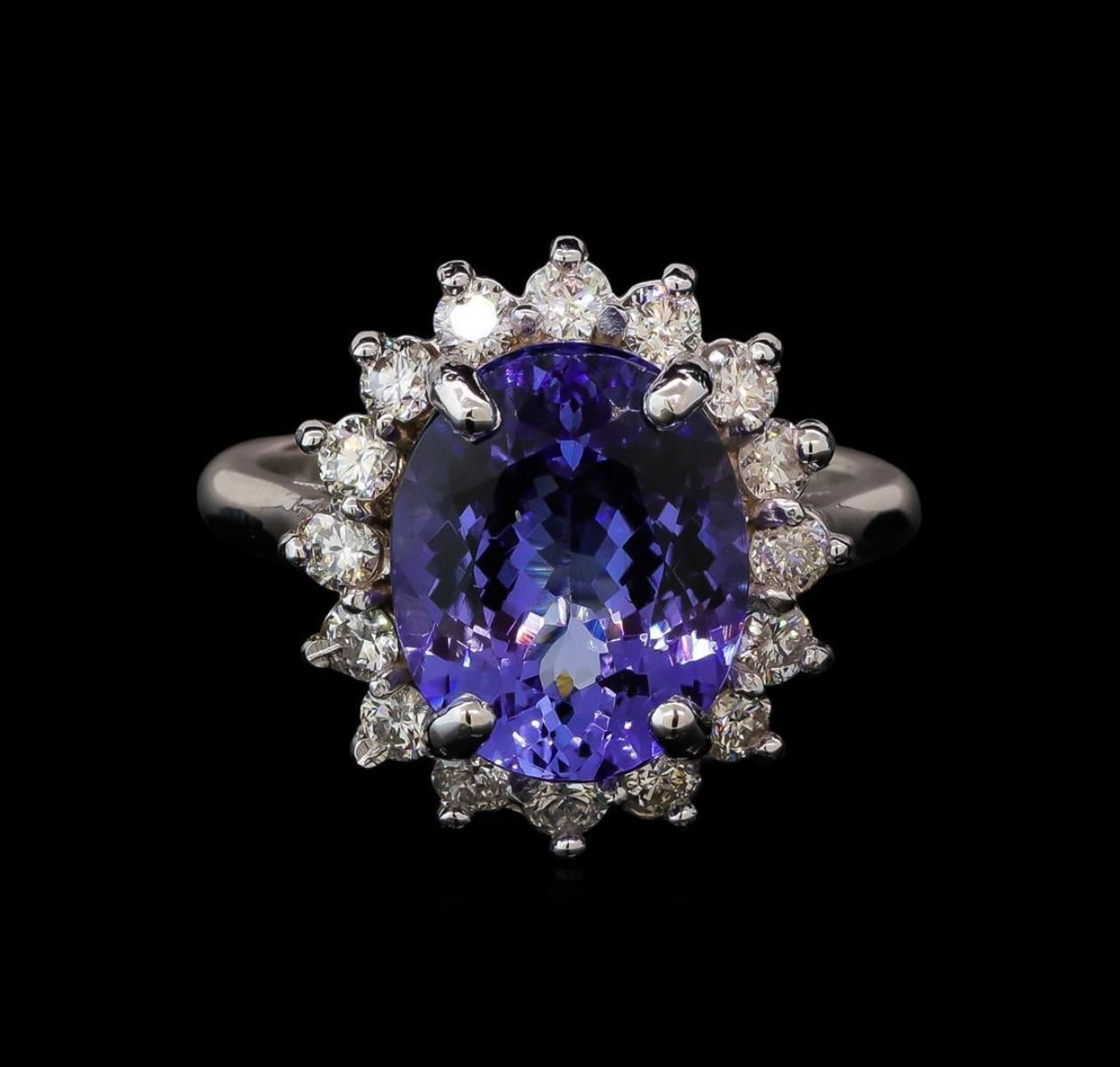 One electronically tested 14KT white gold lady's cast fashion ring with a basket halo with a bright polish finish. The featured lady's ring has a shank measuring 2.12 millimeters wide. Identified with markings of '14K'. Condition is new, good workmanship. Containing: One prong set oval modified brilliant cut natural tanzanite, measuring 12.19 x 9.87 x 6.17mm, (depth est.) 3%. bulge factor, approximate weight of 5.40ct., clarity is eye clean, medium, very slightly grayish, violetish blue color, (GIA vB 5/3), cut is very good. Transmitting light with no distortion, transparent. Colored gemstones are presumed to have been subjected to commonly used enhancement processes. Graded in the setting. Sixteen prong set round brilliant cut diamonds, measuring 2.40 - 2.35 x 1.48mm (depth est.) approximate total weight of 16 Stones = 0.82ct. Graded in the setting. Clarity SI-1 to I-1. Color: H - I Cut Good. Total Weight of Colored Stones 5.40ct.. Total Weight of Diamonds 0.82ct.. Total Weight of Ring 6.30gm