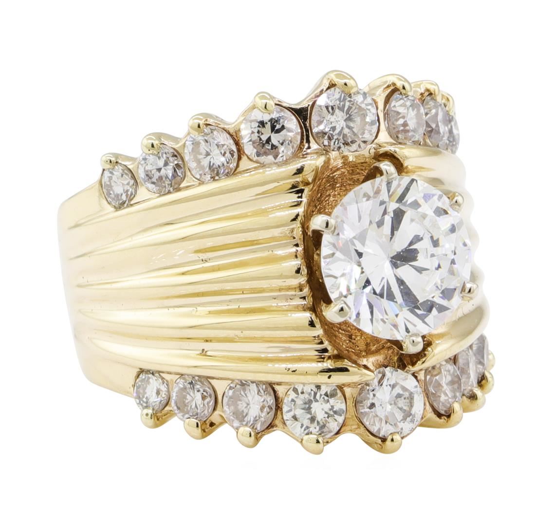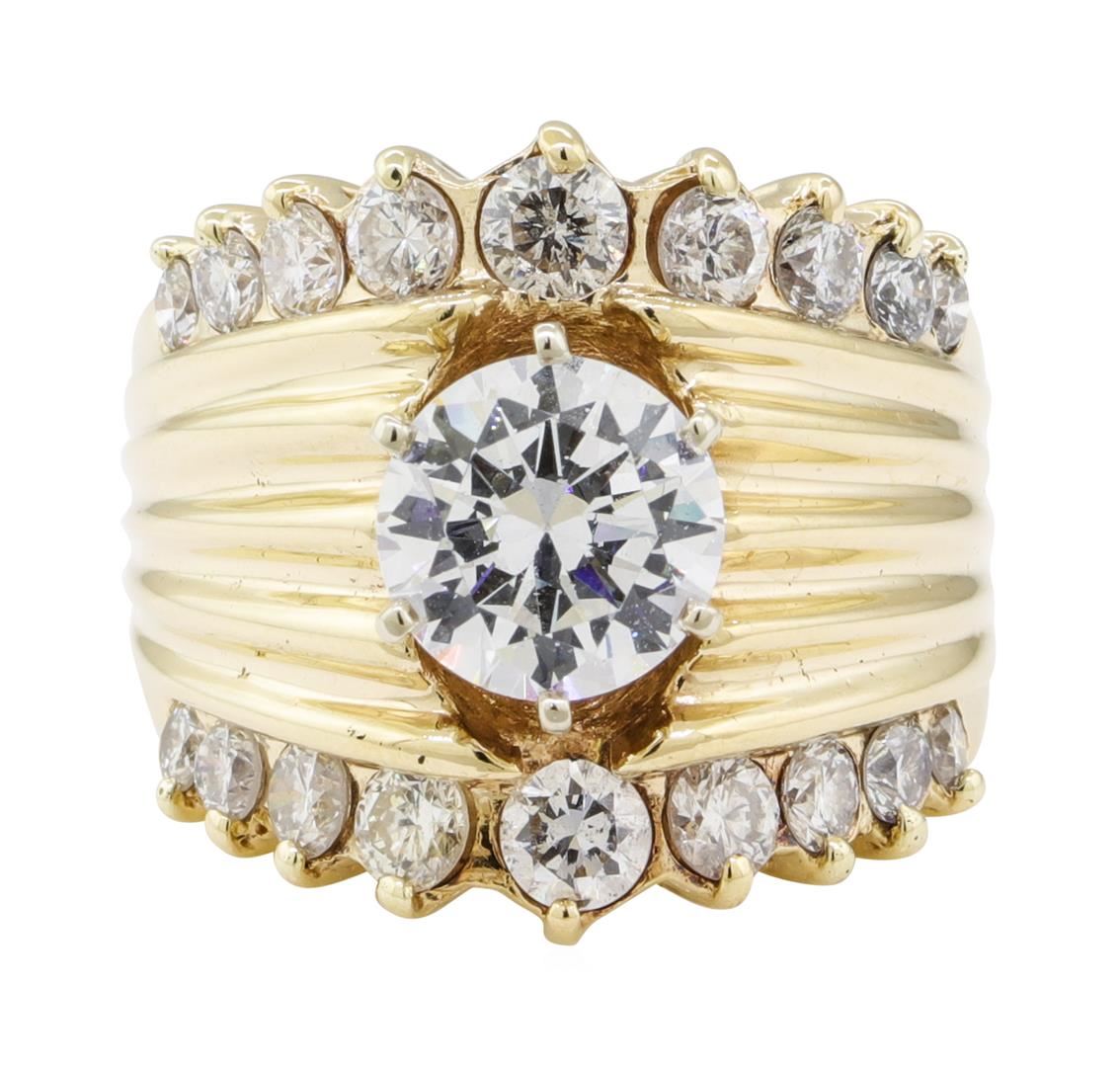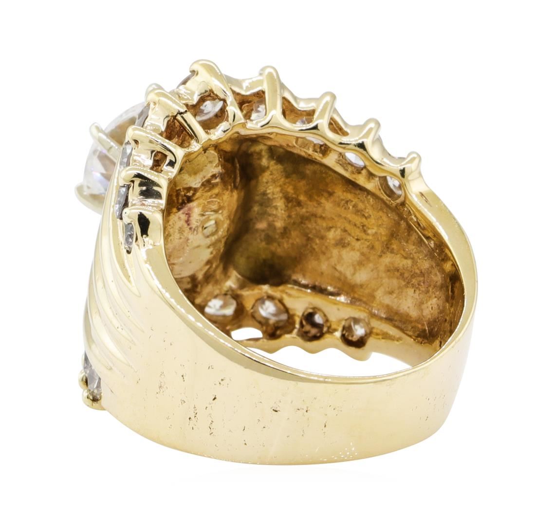 One electronically tested 14KT yellow gold lady's combination cast & assembled fashion ring with a wide band with a bright polish finish. The featured lady's ring has a shank measuring 5.60 millimeters wide. Condition is like new, good workmanship. Containing: One prong set round modified brilliant cut natural cubic zirconium, measuring 8.00 - 8.00 x 4.96 mm, (depth est.) approximate weight of 3.70ct., clarity is eye clean, colorless, white color, (GIA W 0/0), cut is good. Transmitting light with no distortion, transparent. Colored gemstones are presumed to have been subjected to commonly used enhancement processes. Graded in the setting. Eighteen prong set round brilliant cut diamonds, measuring 3.30 - 2.50 x 1.80mm (depth est.) approximate total weight of 18 Stones = 1.70ct. Graded in the setting. Color H - I Clarity VS-2 to SI-1 Cut Very Good. Total Weight of Colored Stones 3.70ct.. Total Weight of Diamonds 1.70ct.. Total Weight of Ring 13.30gm GAS Appraised at $6775.00. GAS Appraised at $6,775.00.