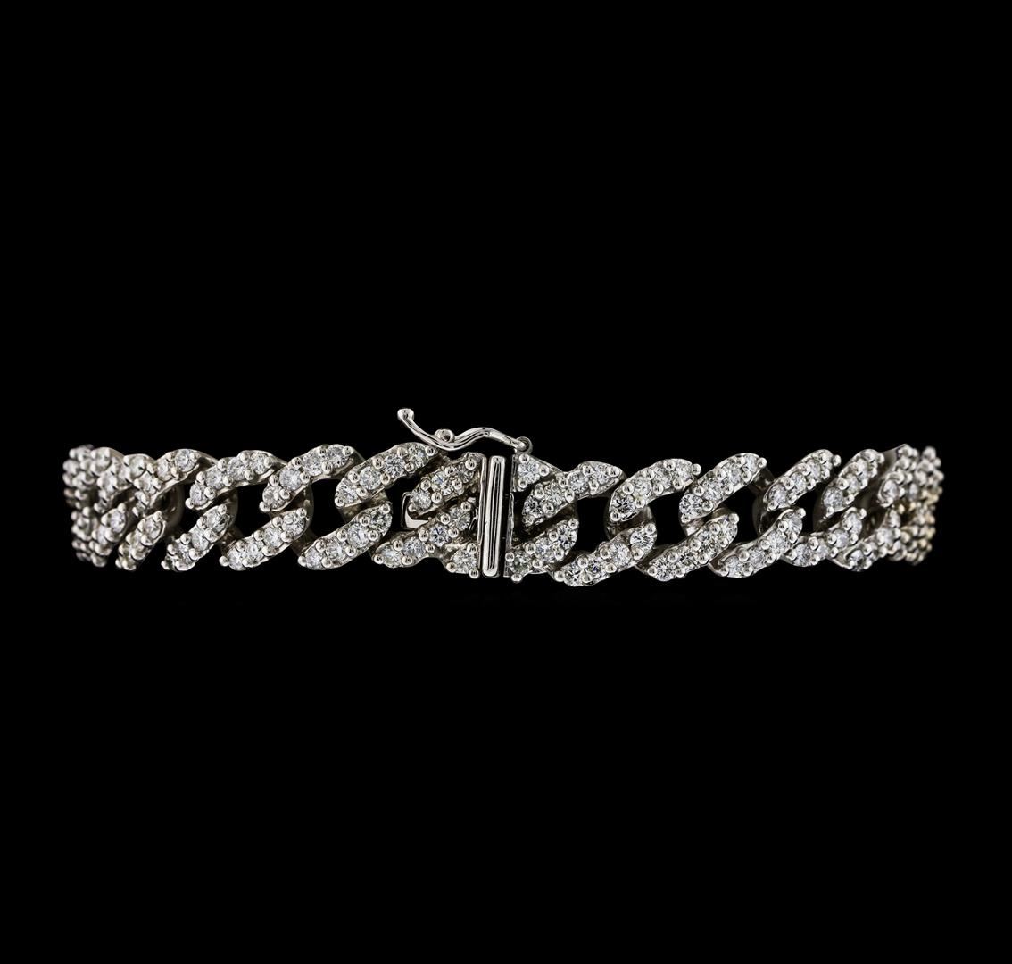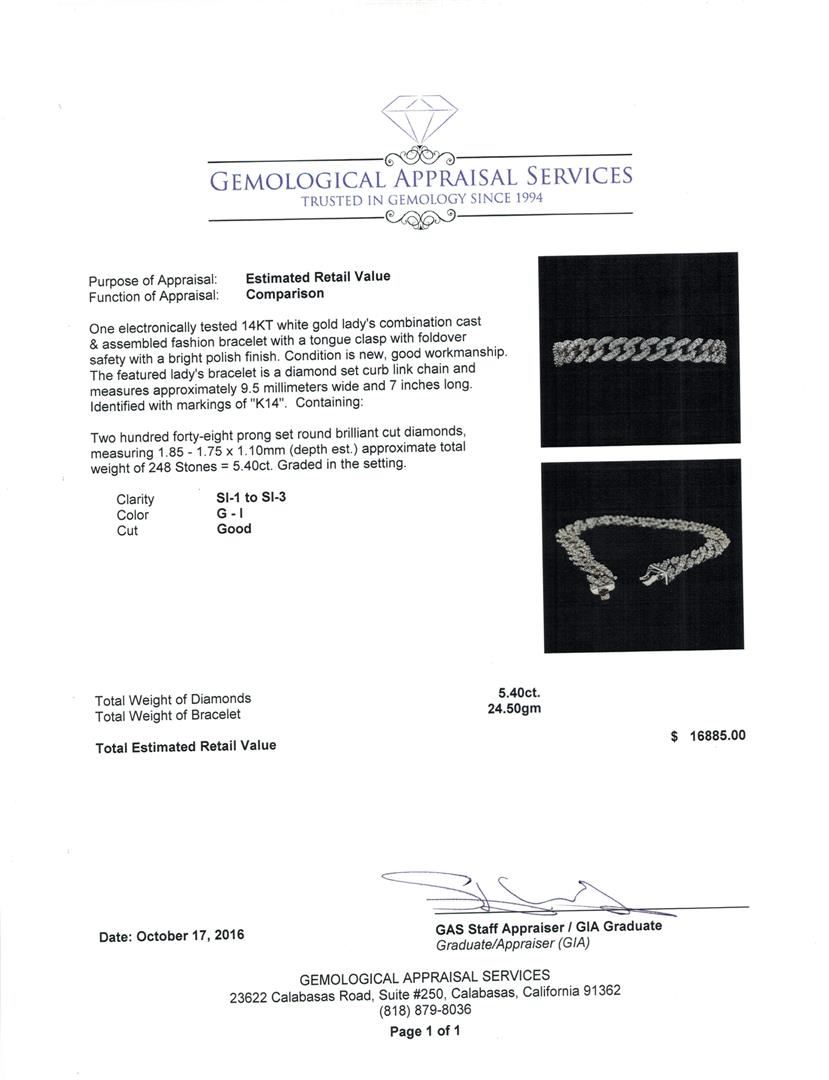 One electronically tested 14KT white gold lady's combination cast & assembled fashion bracelet with a tongue clasp with foldover safety with a bright polish finish. The featured lady's bracelet is a diamond set curb link chain and measures approximately 9.5 millimeters wide and 7 inches long. Identified with markings of 'K14'. Condition is new, good workmanship. Containing: Two Hundred Forty-Eight prong set round brilliant cut diamonds, measuring 1.85 - 1.75 x 1.10mm (depth est.) approximate total weight of 248 Stones = 5.40ct. Graded in the setting. Clarity SI-1 to SI-3. Color: G - I Cut Good. Total Weight of Diamonds 5.40ct.. Total Weight of Bracelet 24.50gm. GAS Appraised at $16,885.00.