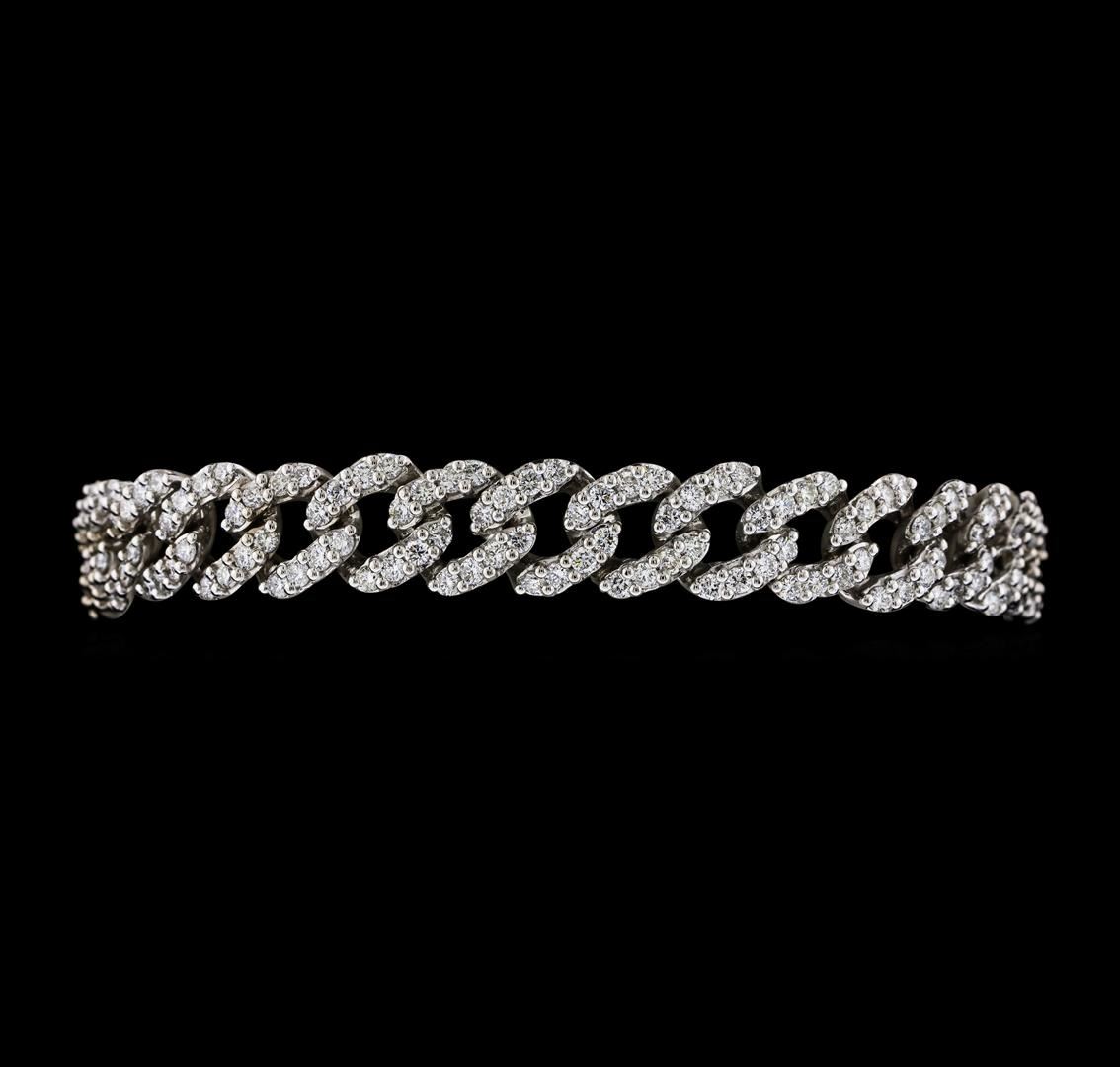 One electronically tested 14KT white gold lady's combination cast & assembled fashion bracelet with a tongue clasp with foldover safety with a bright polish finish. The featured lady's bracelet is a diamond set curb link chain and measures approximately 9.5 millimeters wide and 7 inches long. Identified with markings of 'K14'. Condition is new, good workmanship. Containing: Two Hundred Forty-Eight prong set round brilliant cut diamonds, measuring 1.85 - 1.75 x 1.10mm (depth est.) approximate total weight of 248 Stones = 5.40ct. Graded in the setting. Clarity SI-1 to SI-3. Color: G - I Cut Good. Total Weight of Diamonds 5.40ct.. Total Weight of Bracelet 24.50gm. GAS Appraised at $16,885.00.