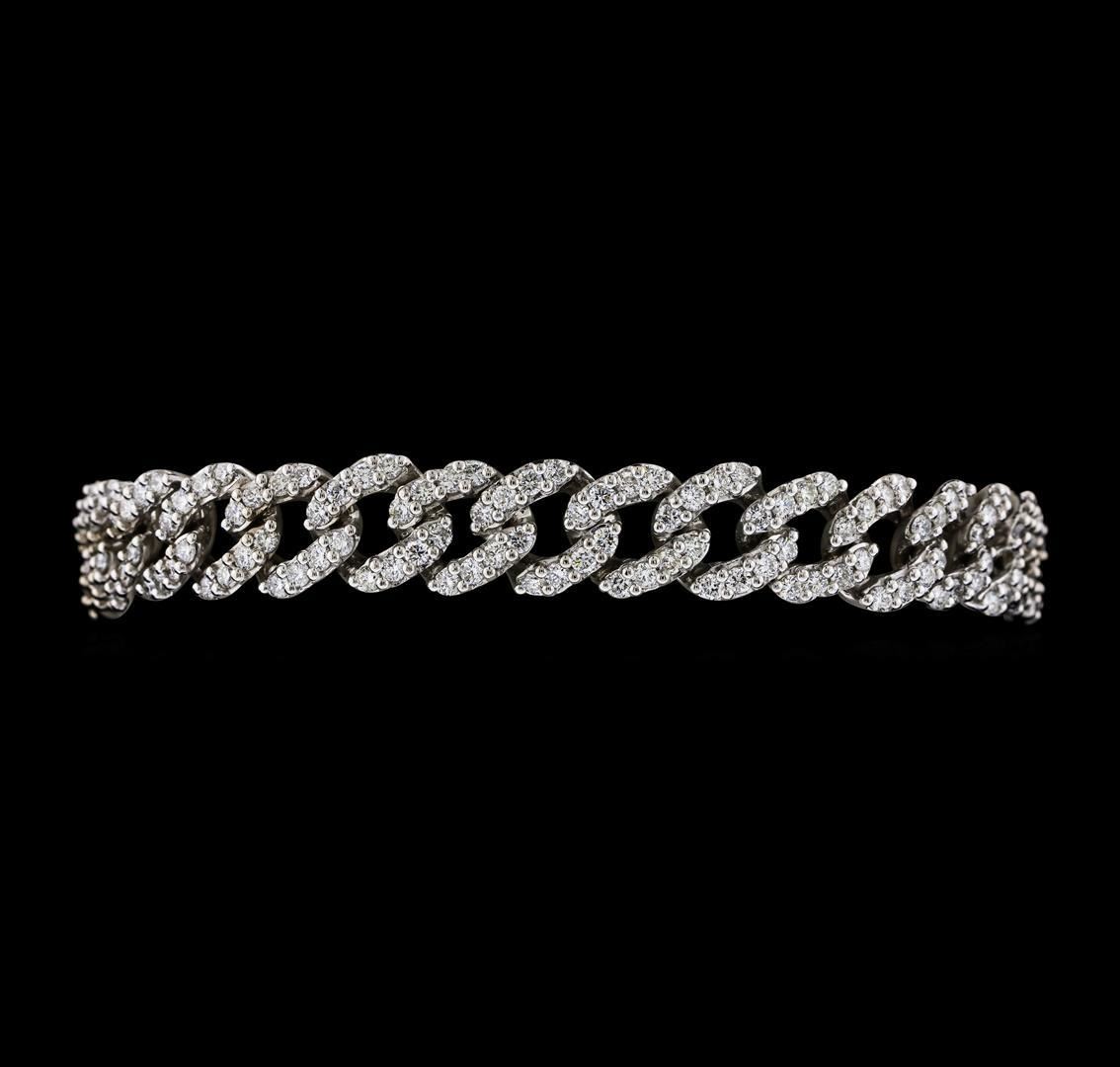 One electronically tested 14KT white gold lady's combination cast & assembled fashion bracelet with a tongue clasp with foldover safety with a bright polish finish. The featured lady's bracelet is a diamond set curb link chain and measures approximately 9.5 millimeters wide and 7 inches long. Identified with markings of 'K14'. Condition is new, good workmanship. Containing: Two Hundred Forty-Eight prong set round brilliant cut diamonds, measuring 1.85 - 1.75 x 1.10mm (depth est.) approximate total weight of 248 Stones = 5.40ct. Graded in the setting. Clarity SI-1 to SI-3. Color: G - I Cut Good. Total Weight of Diamonds 5.40ct.. Total Weight of Bracelet 24.50gm. GAS Appraised.