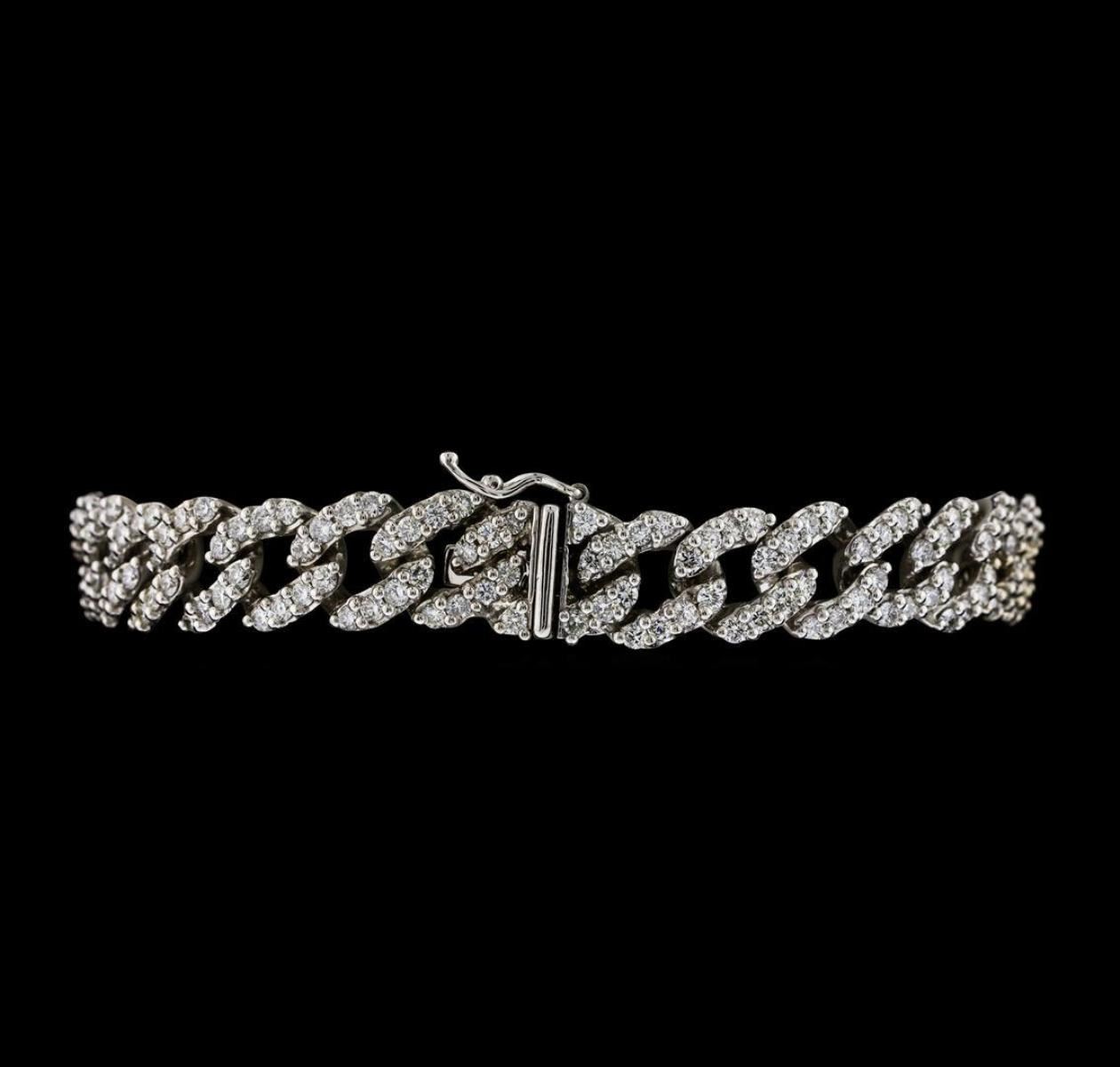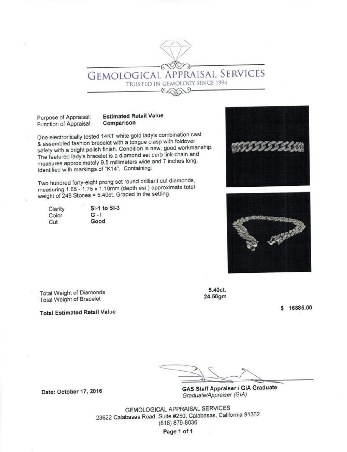 One electronically tested 14KT white gold lady's combination cast & assembled fashion bracelet with a tongue clasp with foldover safety with a bright polish finish. The featured lady's bracelet is a diamond set curb link chain and measures approximately 9.5 millimeters wide and 7 inches long. Identified with markings of 'K14'. Condition is new, good workmanship. Containing: Two Hundred Forty-Eight prong set round brilliant cut diamonds, measuring 1.85 - 1.75 x 1.10mm (depth est.) approximate total weight of 248 Stones = 5.40ct. Graded in the setting. Clarity SI-1 to SI-3. Color: G - I Cut Good. Total Weight of Diamonds 5.40ct.. Total Weight of Bracelet 24.50gm. GAS Appraised.