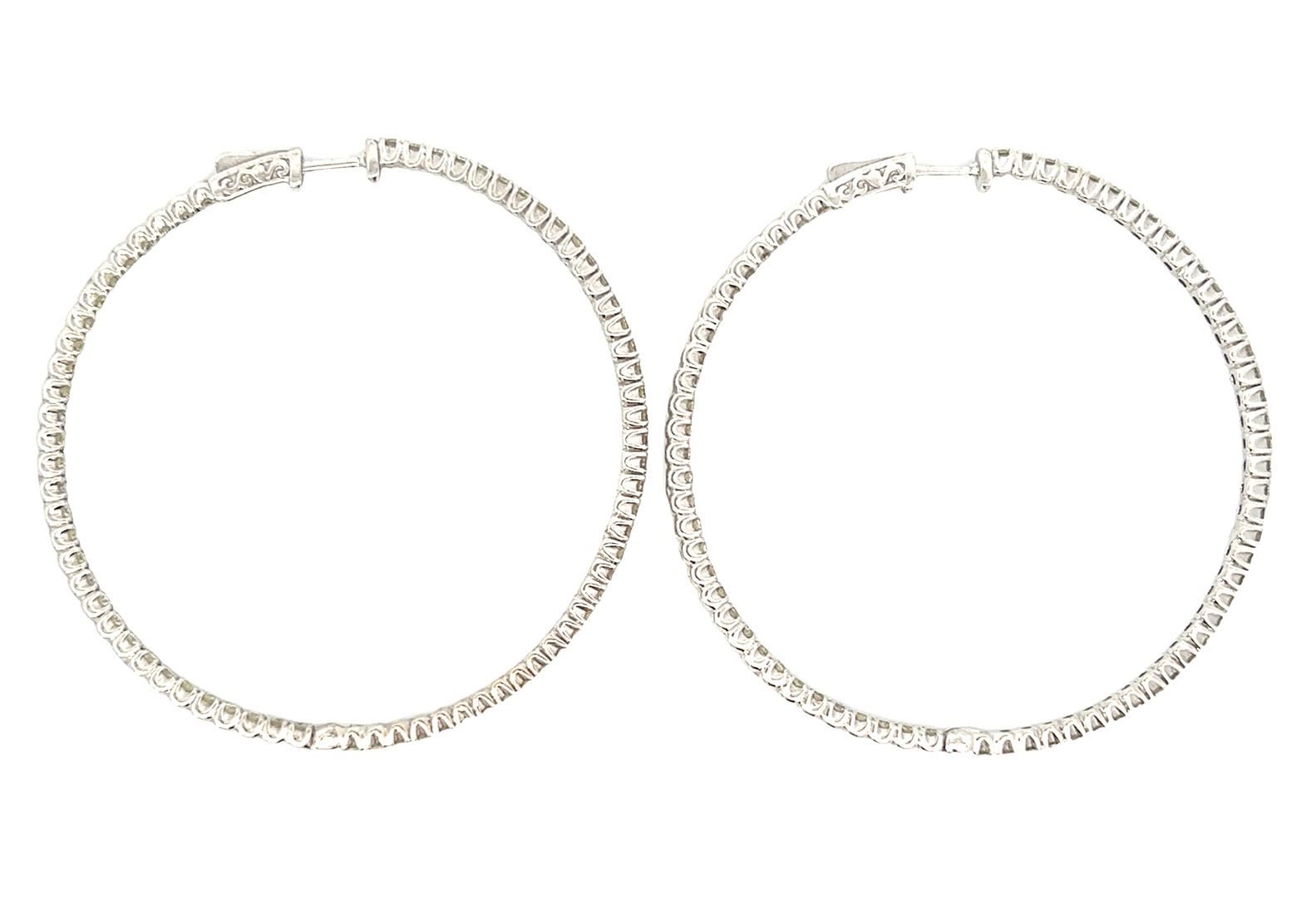 One pair electronically tested 14KT white gold lady's combination cast & assembled fashion inside-out hoop earrings with hinged, snap locking posts with a bright polish finish. The featured hoop earring has a diameter of 57.00 millimeter. Identified with markings of "14K". Condition is new, good workmanship. Containing: One Hundred Thirty-Eight prong set round brilliant cut diamonds, measuring 2.20 - 2.10 x 1.38mm (depth est.) approximate total weight of 138 Stones = 5.40ct. Graded in the setting. Color I - J Clarity VS-2 to SI-1 Cut Very Good Total Weight of Diamonds 5.40ct. Total Weight of Earrings 16.10gm Estimated Retail Value $ 19300.00