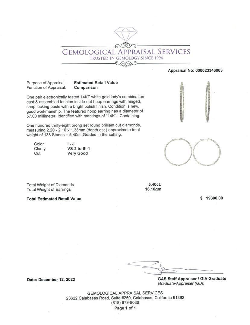 One pair electronically tested 14KT white gold lady's combination cast & assembled fashion inside-out hoop earrings with hinged, snap locking posts with a bright polish finish. The featured hoop earring has a diameter of 57.00 millimeter. Identified with markings of "14K". Condition is new, good workmanship. Containing: One Hundred Thirty-Eight prong set round brilliant cut diamonds, measuring 2.20 - 2.10 x 1.38mm (depth est.) approximate total weight of 138 Stones = 5.40ct. Graded in the setting. Color I - J Clarity VS-2 to SI-1 Cut Very Good Total Weight of Diamonds 5.40ct. Total Weight of Earrings 16.10gm Estimated Retail Value $ 19300.00