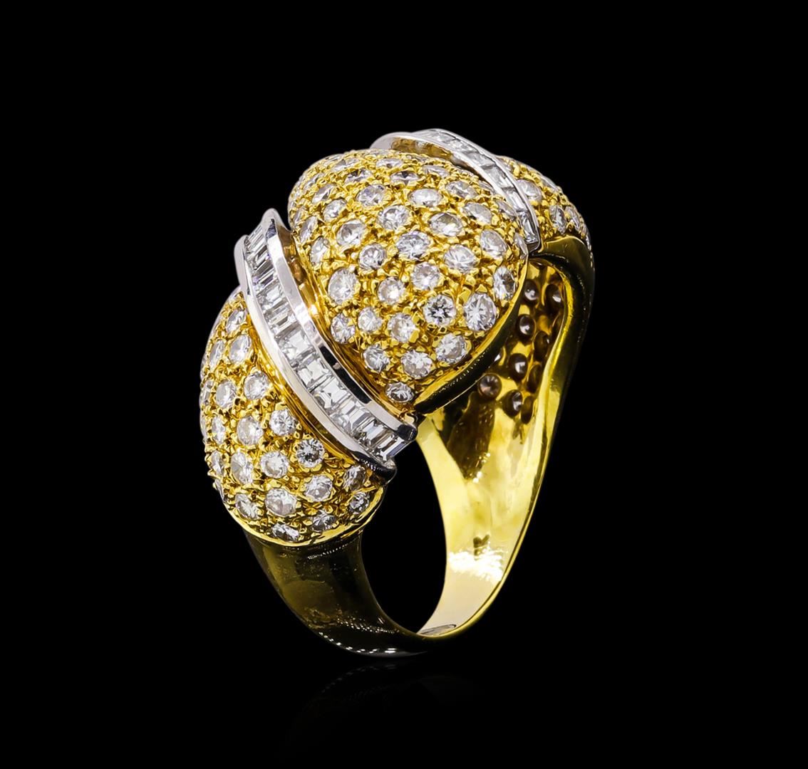 One electronically tested 18KT yellow gold ladies cast diamond ring. The ring features three diamond curvatures with baguette diamond ribbon accents supported by tapering shoulders, completed by a four millimeter wide band. Bright polish finish with rhodium accents. Identified with markings of "18K". Condition is good. Containing: Forty-Three channel set baguette cut (tapered) diamonds, measuring from 2.00 x 1.50 x 1.05mm (depth est.) to 2.10 x 1.80 x 1.26mm (depth est.) approximate total weight of 43 Stones = 1.54ct. Graded in the setting. Clarity: VS-1 to VS-2. Color: E - G One Hundred Forty-Three prong set round brilliant cut diamonds, measuring 2.40 - 1.50 x 1.17mm (depth est.) approximate total weight of 143 Stones = 3.86ct. Graded in the setting. Clarity: SI-1 to SI-2. Color: D - F. Total Weight of Diamonds 5.40ct. Total Weight of Ring 22.69gm. AIG Appraised at $24,360.00.