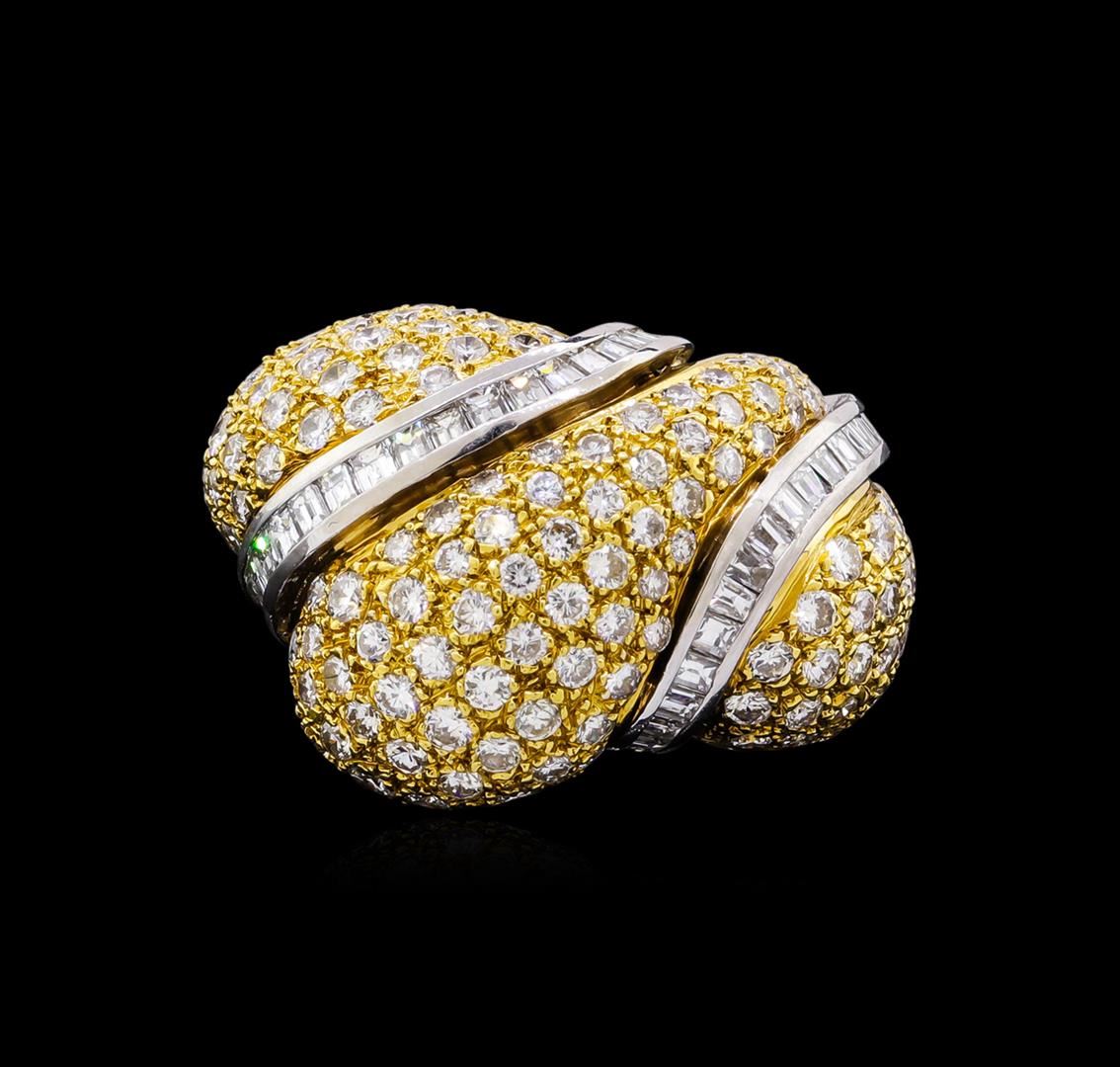 One electronically tested 18KT yellow gold ladies cast diamond ring. The ring features three diamond curvatures with baguette diamond ribbon accents supported by tapering shoulders, completed by a four millimeter wide band. Bright polish finish with rhodium accents. Identified with markings of "18K". Condition is good. Containing: Forty-Three channel set baguette cut (tapered) diamonds, measuring from 2.00 x 1.50 x 1.05mm (depth est.) to 2.10 x 1.80 x 1.26mm (depth est.) approximate total weight of 43 Stones = 1.54ct. Graded in the setting. Clarity: VS-1 to VS-2. Color: E - G One Hundred Forty-Three prong set round brilliant cut diamonds, measuring 2.40 - 1.50 x 1.17mm (depth est.) approximate total weight of 143 Stones = 3.86ct. Graded in the setting. Clarity: SI-1 to SI-2. Color: D - F. Total Weight of Diamonds 5.40ct. Total Weight of Ring 22.69gm. AIG Appraised at $24,360.00.