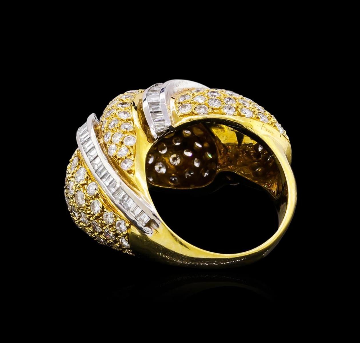 One electronically tested 18KT yellow gold ladies cast diamond ring. The ring features three diamond curvatures with baguette diamond ribbon accents supported by tapering shoulders, completed by a four millimeter wide band. Bright polish finish with rhodium accents. Identified with markings of "18K". Condition is good. Containing: Forty-Three channel set baguette cut (tapered) diamonds, measuring from 2.00 x 1.50 x 1.05mm (depth est.) to 2.10 x 1.80 x 1.26mm (depth est.) approximate total weight of 43 Stones = 1.54ct. Graded in the setting. Clarity: VS-1 to VS-2. Color: E - G One Hundred Forty-Three prong set round brilliant cut diamonds, measuring 2.40 - 1.50 x 1.17mm (depth est.) approximate total weight of 143 Stones = 3.86ct. Graded in the setting. Clarity: SI-1 to SI-2. Color: D - F. Total Weight of Diamonds 5.40ct. Total Weight of Ring 22.69gm. AIG Appraised.