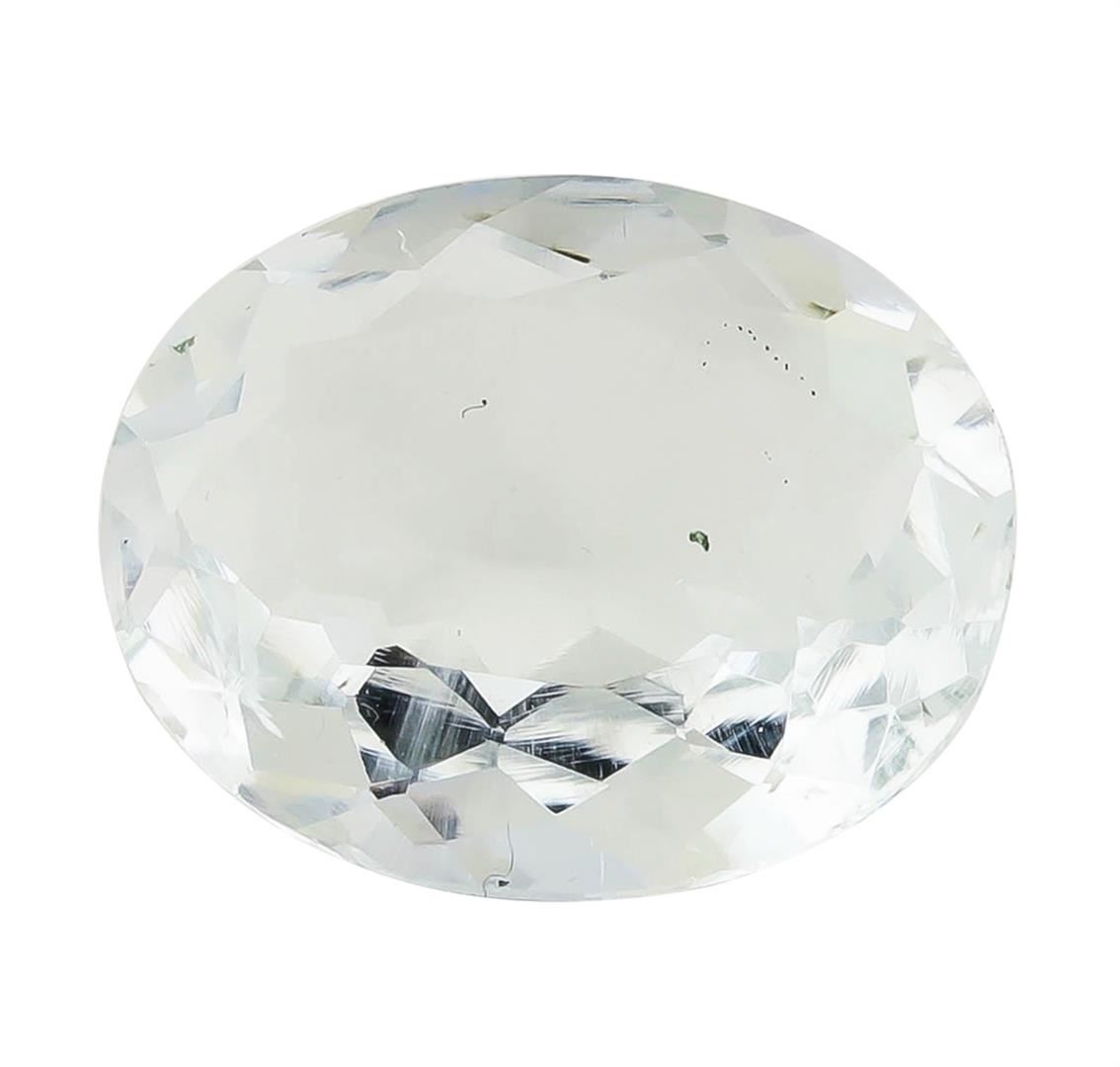 One natural oval cut aquamarine with an exact weight of 5.41ct., clarity is slightly included, slightly grayish greenish blue. Gemological Appraisals Services estimates the retail value at $1893.5 GAS Appraised.
