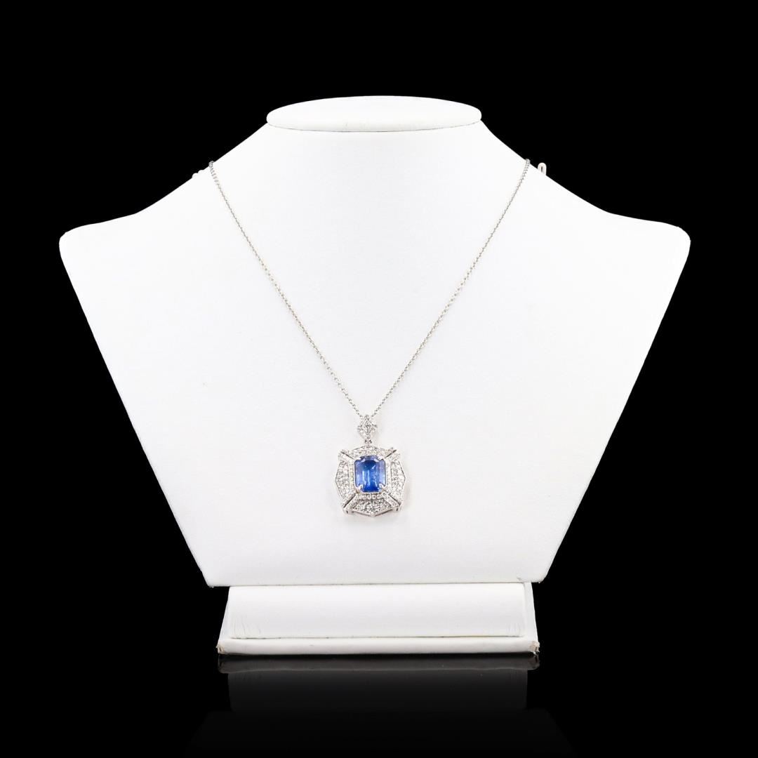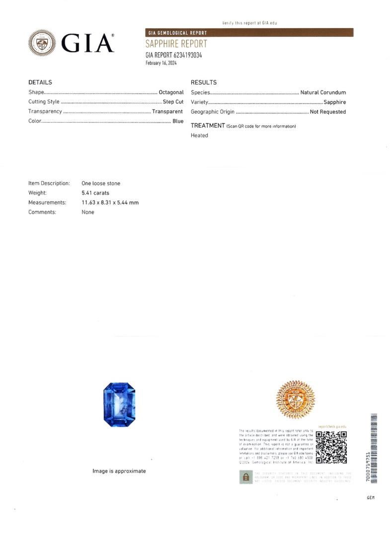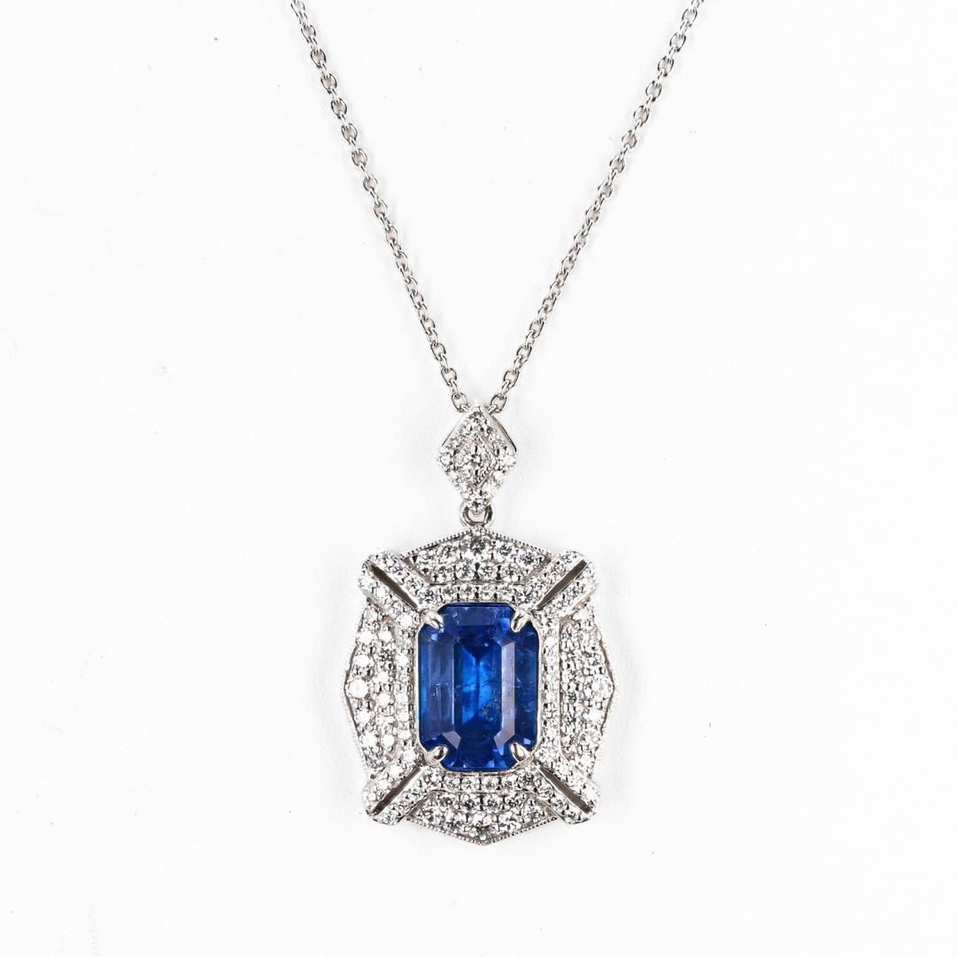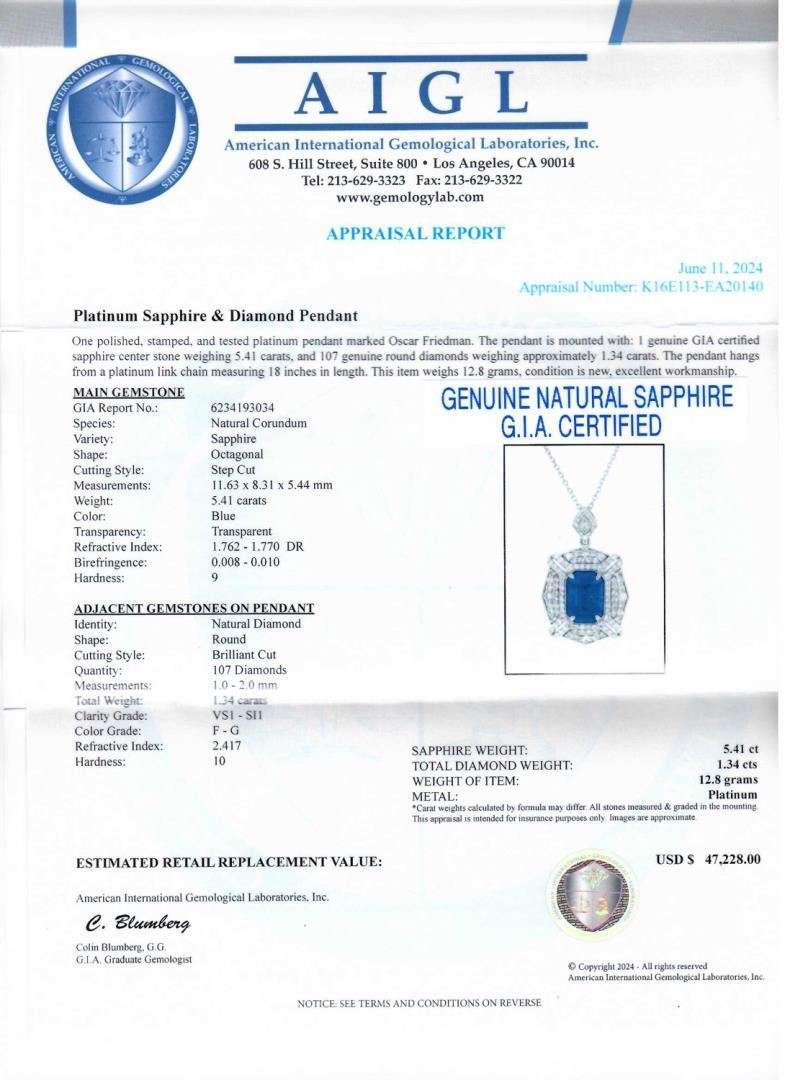 One polished. stamped. and tested platinum pendant marked Oscar Friedman. The pendant is mounted with: 1 genuine GIA certified sapphire center stone weighing 5.41 carats, and 107 genuine round diamonds weighing approximately 1.34 carats. The pendant hangs from a platinum link chain measuring 18 inches in length. This item weighs 12.8 grams, condition is new, excellent workmanship. #MAIN GEMSTONE# GIA Report No. 234193034; Species: Natural Corundum; Variety: Sapphire; Shape: Octagonal; Cutting Style: Step Cut; Measurements: 11.63 x 8.31 x 5.44mm; Weight: 5.41 carats; Color: Blue; Transparency: Transparent; Refractive Index: 1.762 - 1.770 DR; Birefringence: 0.008 - 0.010; Hardness: 9 #ADJACENT GEMSTONES ON PENDANT# Identity: Natural Diamond; Shape: Round; Cutting Style: Brilliant Cut; Quantity: 107 Diamonds; Measurements: 1.0 - 2.0mm; Total Weight: 1.34 carats; Clarity Grade: VS1-SI1; Color Grade: F-G; Refractive Index: 2.417; Hardness: 10; SAPPHIRE WEIGHT: 5.41 ct; TOTAL DIAMOND WEIGHT: 1.34 cts; WEIGHT OF ITEM: 12.8 grams; METAL: Platinum #Size: 18