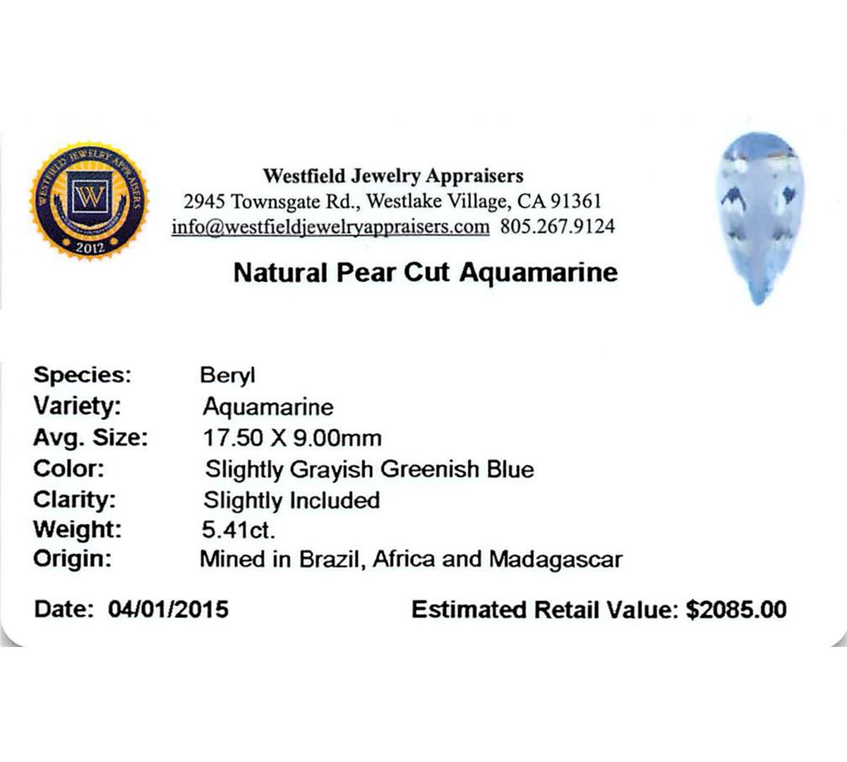 One pear cut natural aquamarine exact weight 5.41ct., clarity is slightly included, type I, medium, very slightly grayish, very slightly greenish blue color, (GIA vslgB 5/3), cut is good. Westfield Appraised at $2,085.00.
