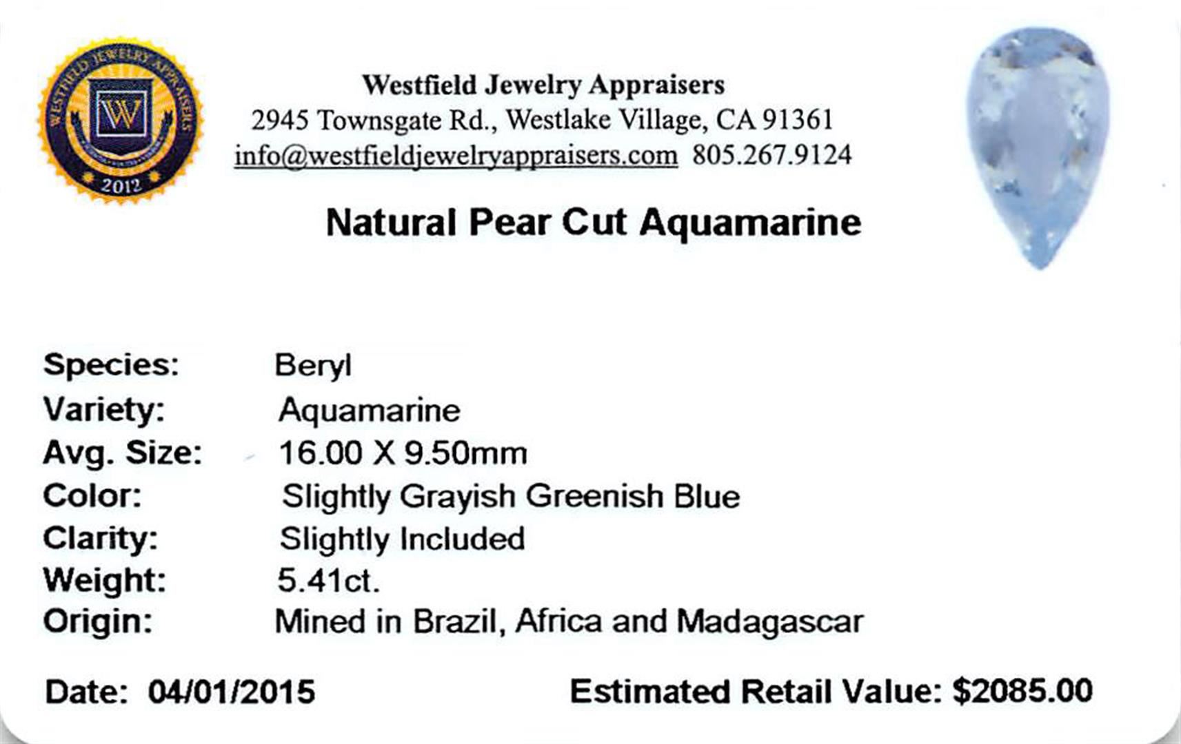 One pear cut natural aquamarine exact weight 5.41ct., clarity is slightly included, type I, medium, slightly grayish, very slightly greenish blue color, (GIA vslgB 5/2), cut is good. Westfield Appraised at $2,085.00.