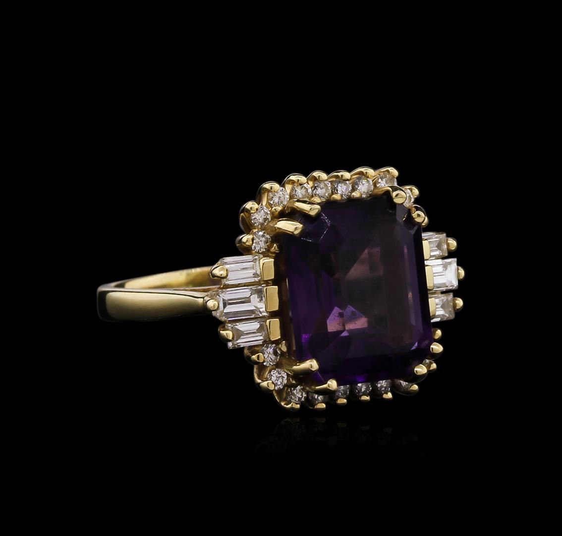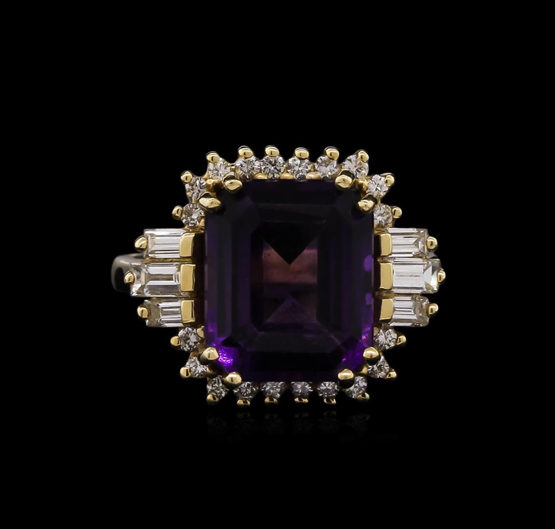 One electronically tested 14KT yellow gold lady's combination cast & assembled fashion ring with a basket halo with a bright polish finish. The featured lady's ring has a shank measuring 2.27 millimeters in width. Identified with markings of "14K". Condition is used, good workmanship. Containing: One prong set emerald step cut natural amethyst, measuring 11.76 x 9.80 x 6.23mm, 5%. bulge factor, approximate weight of 5.41ct., clarity is eye clean, type II, medium dark, moderately strong, reddish purple color, (GIA rP 6/4), cut is very good. Colored gemstones are presumed to have been subjected to commonly used enhancement processes. Graded in the setting. Two prong set baguette cut diamonds, measuring from 3.60 x 2.00 x 1.70mm (depth est.) to 3.65 x 2.00 x 1.70mm (depth est.) approximate total weight of 2 Stones = 0.23ct. Graded in the setting. Clarity: VS-1 to VS-2. Color: G - Very Good Four prong set baguette cut diamonds, measuring from 2.40 x 1.90 x 1.62mm (depth est.) to 2.50 x 2.00 x 1.70mm (depth est.) approximate total weight of 4 Stones = 0.30ct. Graded in the setting. Clarity: VS-1 to VS-2. Color: G - Very Good Twenty prong set round brilliant cut diamonds, measuring 1.30 - 1.20 x 0.78mm (depth est.) approximate total weight of 20 Stones = 0.15ct. Graded in the setting. Clarity: VS-1 to SI-1. Color: H - I. Cut Good. Total Weight of Colored Stones 5.41ct. Total Weight of Diamonds 0.68ct. Total Weight of Ring 6.00gm. GAS Appraised at $3,555.00.