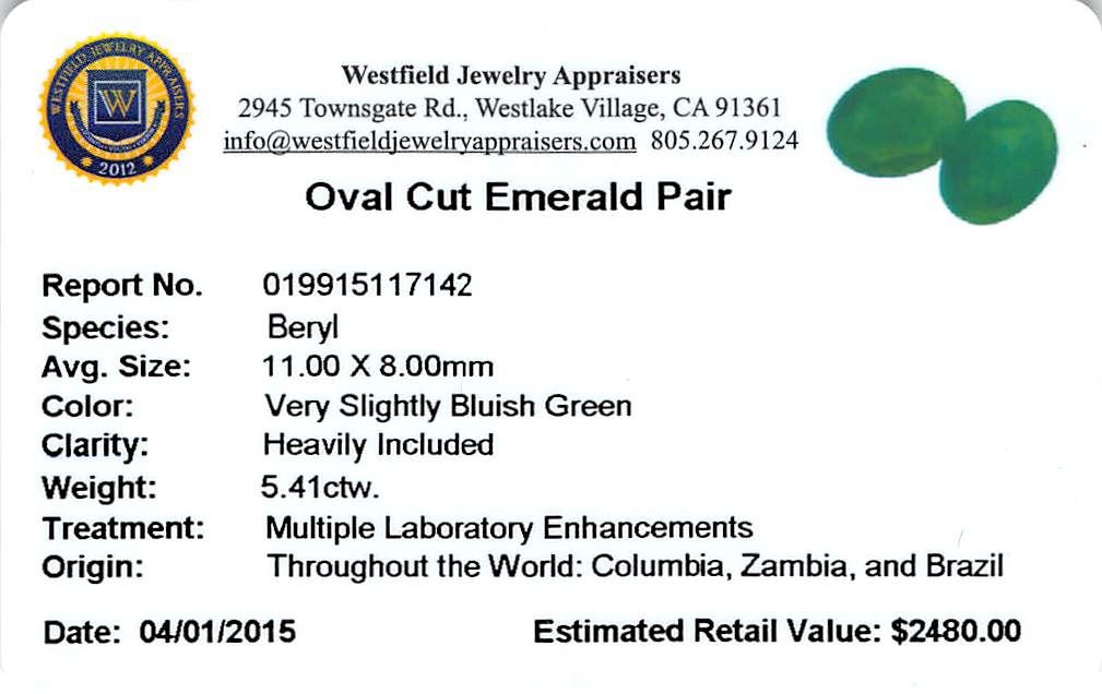 Two oval mixed cut natural emeralds exact total weight 5.41ct., clarity is heavily included, type III, medium dark, very slightly grayish, very slightly bluish green color, (GIA vslbG 6/3), cut is good. Westfield Appraised at $2,480.00.