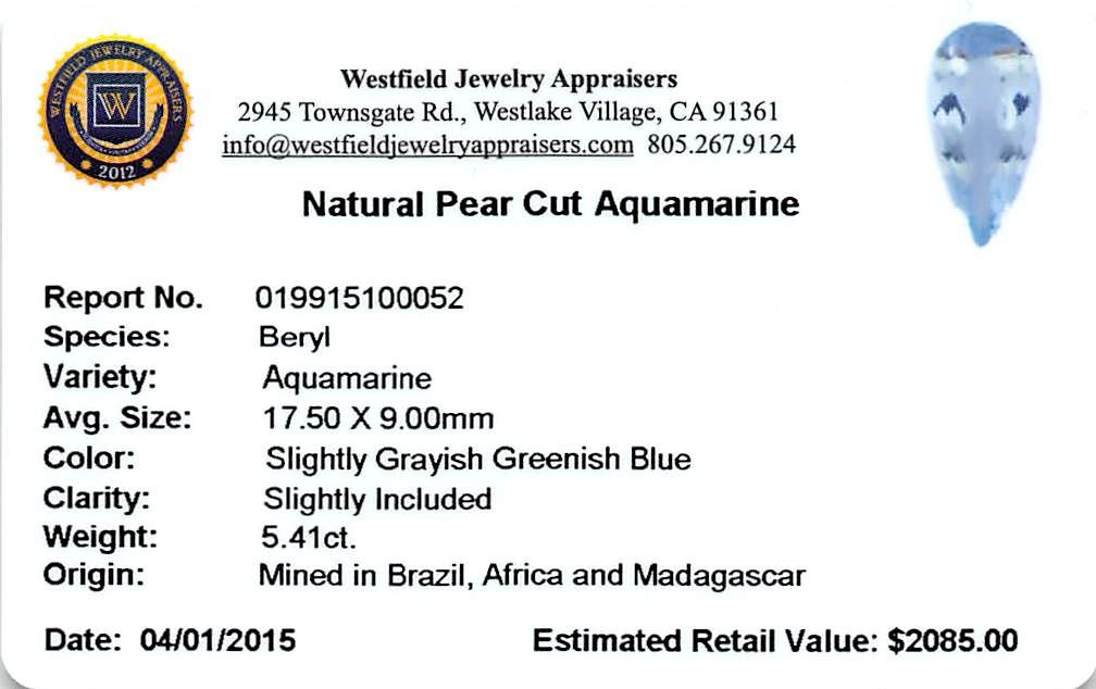 One pear cut natural aquamarine exact weight 5.41ct., clarity is slightly included, type I, medium, very slightly grayish, very slightly greenish blue color, (GIA vslgB 5/3), cut is good. Westfield Appraised at $2,085.00.