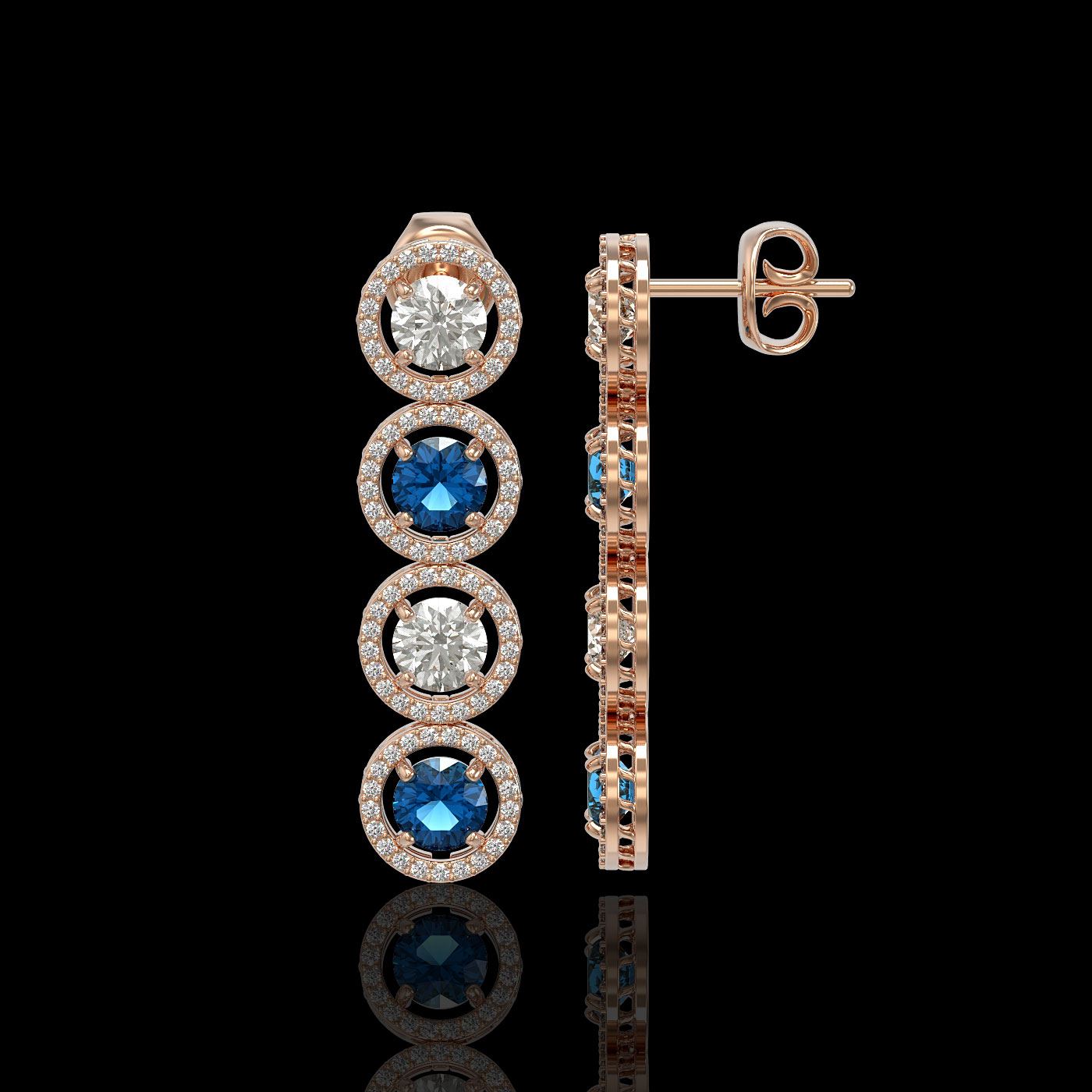 REF-685W3F -42594 ---- 5.42 CTW Blue & White Diamond Designer Earrings 18K Rose Gold ---- Luxury Designer Brand Earring Appraised at $30,150 Certificate Number US42594 18K Rose gold, Earring Size is 1 1/2 Inches Long, Earring measuring approx. 9 x 36 mm Long, weighing in total approx. 9 grams. Made in the USA and is stamped 18K, Main stone 2.04 carat total weight containing 4 pieces of I-J color with VS/SI quality Round shape cut Diamond , Stone #2 2.04 carat total weight containing 4 pieces of Intense Blue color with SI/I quality Round shape cut Diamond , Stone #3 1.34 carat total weight containing pieces of G-H color with VS/SI quality Round shape cut Diamond
