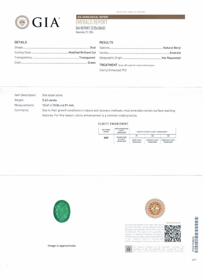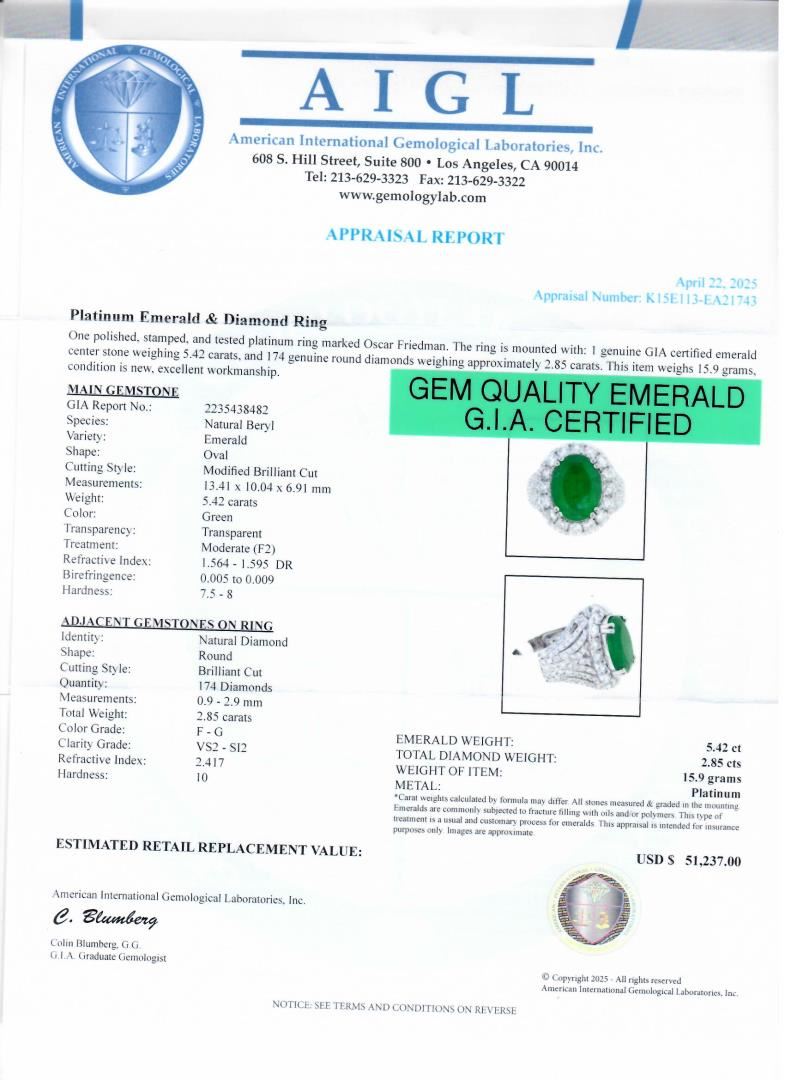 One polished, stamped, and tested platinum ring marked Oscar Friedman. The ring is mounted with: 1 genuine GIA certified emerald center stone weighing 5.42 carats, and 174 genuine round diamonds weighing approximately 2.85 carats. This item weighs 15.9 grams, condition is new, excellent workmanship. #MAIN GEMSTONE# GIA Report No.: 2235438482 Species: Natural Beryl Variety: Emerald Shape: Oval Cutting Style: Modified Brilliant Cut Measurements: 13.41 x 10.04 x 6.91mm Weight: 5.42 carats Color: Green Transparency: Transparent Treatment: Moderate (F2) Refractive Index: 1.564 - 1.595 DR Birefringence: 0.005 to 0.009 Hardness: 7.5 - 8 #ADJACENT GEMSTONES ON RING# Identity: Natural Diamond Shape: Round Cutting Style: Brilliant Cut Quantity: 174 Diamonds Measurements: 0.9 - 2.9mm Total Weight: 2.85 carats Color Grade: F-G Clarity Grade: VS2-SI2 Refractive Index: 2.417 Hardness: 10 #EMERALD WEIGHT: 5.42 ct TOTAL DIAMOND WEIGHT: 2.85 cts WEIGHT OF ITEM: 15.9 grams METAL: Platinum Size: 7