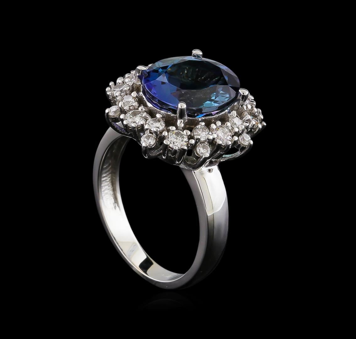 One electronically tested 14KT white gold lady's cast fashion ring with a basket double halo with a bright polish finish. The featured lady's ring has a shank measuring 2.93 millimeters wide. Identified with markings of "14K". Condition is new, good workmanship. Containing: One prong set oval modified brilliant cut natural tanzanite, measuring 11.97 x 9.85 x 6.74mm, approximate weight of 5.42ct., clarity is eye clean, type I, medium, moderately strong, bluish violet color, (GIA bV 5/4), cut is very good. The featured tanzanite has a slight green overtone. Transmitting light with no distortion, transparent. Colored gemstones are presumed to have been subjected to commonly used enhancement processes. Graded in the setting. Eight prong set round brilliant cut diamonds, measuring 2.60 - 2.50 x 1.58mm (depth est.) approximate total weight of 8 Stones = 0.50ct. Graded in the setting. Clarity: VS-2 to SI-2. Color: H - I. Cut Very Good Sixteen prong set round brilliant cut diamonds, measuring 1.90 - 1.60 x 1.09mm (depth est.) approximate total weight of 16 Stones = 0.33ct. Graded in the setting. Clarity: SI-1 to SI-2. Color: H - I. Cut Good. Total Weight of Colored Stones 5.42ct. Total Weight of Diamonds 0.83ct. Total Weight of Ring 6.80gm. GAS Appraised at $11,415.00.