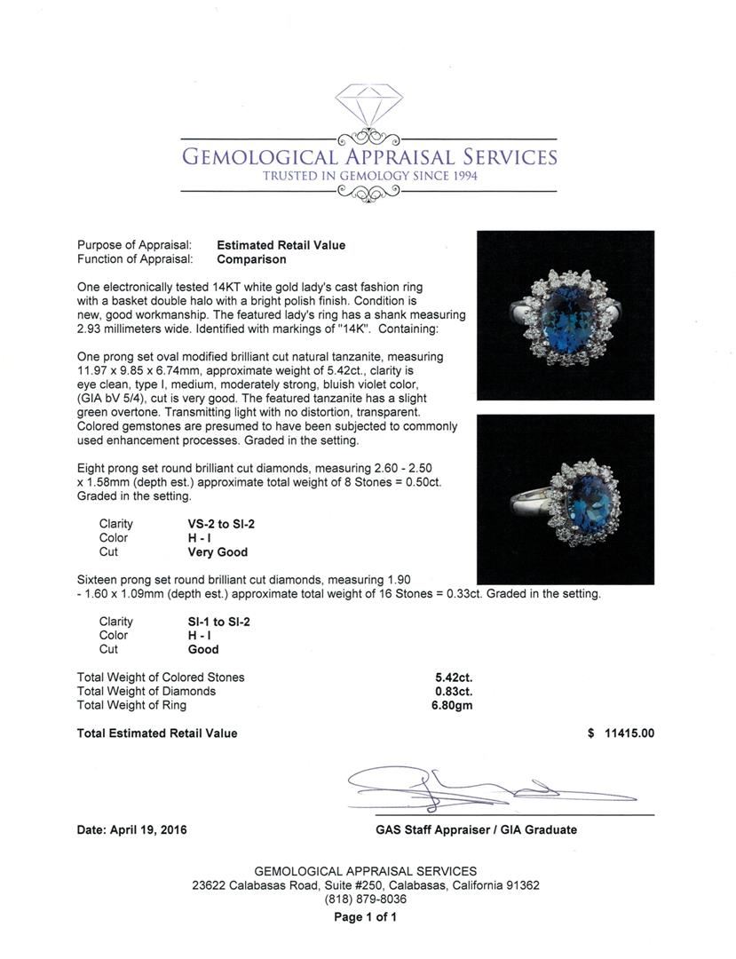 One electronically tested 14KT white gold lady's cast fashion ring with a basket double halo with a bright polish finish. The featured lady's ring has a shank measuring 2.93 millimeters wide. Identified with markings of "14K". Condition is new, good workmanship. Containing: One prong set oval modified brilliant cut natural tanzanite, measuring 11.97 x 9.85 x 6.74mm, approximate weight of 5.42ct., clarity is eye clean, type I, medium, moderately strong, bluish violet color, (GIA bV 5/4), cut is very good. The featured tanzanite has a slight green overtone. Transmitting light with no distortion, transparent. Colored gemstones are presumed to have been subjected to commonly used enhancement processes. Graded in the setting. Eight prong set round brilliant cut diamonds, measuring 2.60 - 2.50 x 1.58mm (depth est.) approximate total weight of 8 Stones = 0.50ct. Graded in the setting. Clarity: VS-2 to SI-2. Color: H - I. Cut Very Good Sixteen prong set round brilliant cut diamonds, measuring 1.90 - 1.60 x 1.09mm (depth est.) approximate total weight of 16 Stones = 0.33ct. Graded in the setting. Clarity: SI-1 to SI-2. Color: H - I. Cut Good. Total Weight of Colored Stones 5.42ct. Total Weight of Diamonds 0.83ct. Total Weight of Ring 6.80gm. GAS Appraised at $11,415.00.