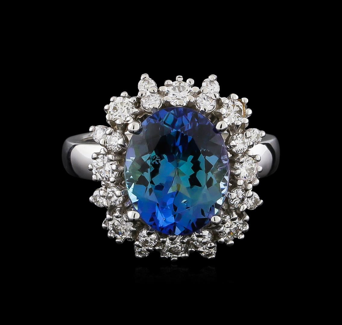One electronically tested 14KT white gold lady's cast fashion ring with a basket double halo with a bright polish finish. The featured lady's ring has a shank measuring 2.93 millimeters wide. Identified with markings of "14K". Condition is new, good workmanship. Containing: One prong set oval modified brilliant cut natural tanzanite, measuring 11.97 x 9.85 x 6.74mm, approximate weight of 5.42ct., clarity is eye clean, type I, medium, moderately strong, bluish violet color, (GIA bV 5/4), cut is very good. The featured tanzanite has a slight green overtone. Transmitting light with no distortion, transparent. Colored gemstones are presumed to have been subjected to commonly used enhancement processes. Graded in the setting. Eight prong set round brilliant cut diamonds, measuring 2.60 - 2.50 x 1.58mm (depth est.) approximate total weight of 8 Stones = 0.50ct. Graded in the setting. Clarity: VS-2 to SI-2. Color: H - I. Cut Very Good Sixteen prong set round brilliant cut diamonds, measuring 1.90 - 1.60 x 1.09mm (depth est.) approximate total weight of 16 Stones = 0.33ct. Graded in the setting. Clarity: SI-1 to SI-2. Color: H - I. Cut Good. Total Weight of Colored Stones 5.42ct. Total Weight of Diamonds 0.83ct. Total Weight of Ring 6.80gm. GAS Appraised at $11,415.00.