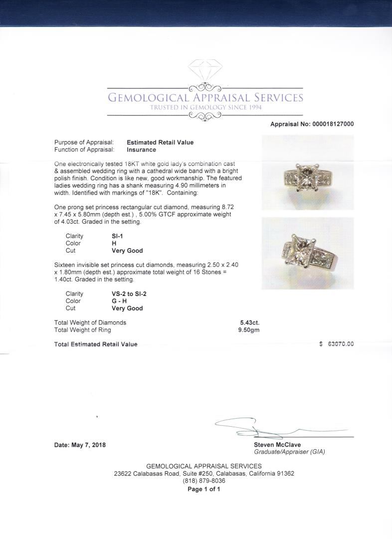 This 18KT white gold ring showcases a 4.03ct princess rectangular cut diamond, graded SI-1 clarity, H color, and Very Good cut. The center stone is accented by sixteen invisible-set princess cut diamonds totaling 1.40ct, with clarity grades of VS-2 to SI-2 and G-H color. The ring features a cathedral wide band design with a bright polished finish and is marked "18K." Graded in the setting, this piece has a total diamond weight of 5.43ct and weighs 9.50 grams overall.